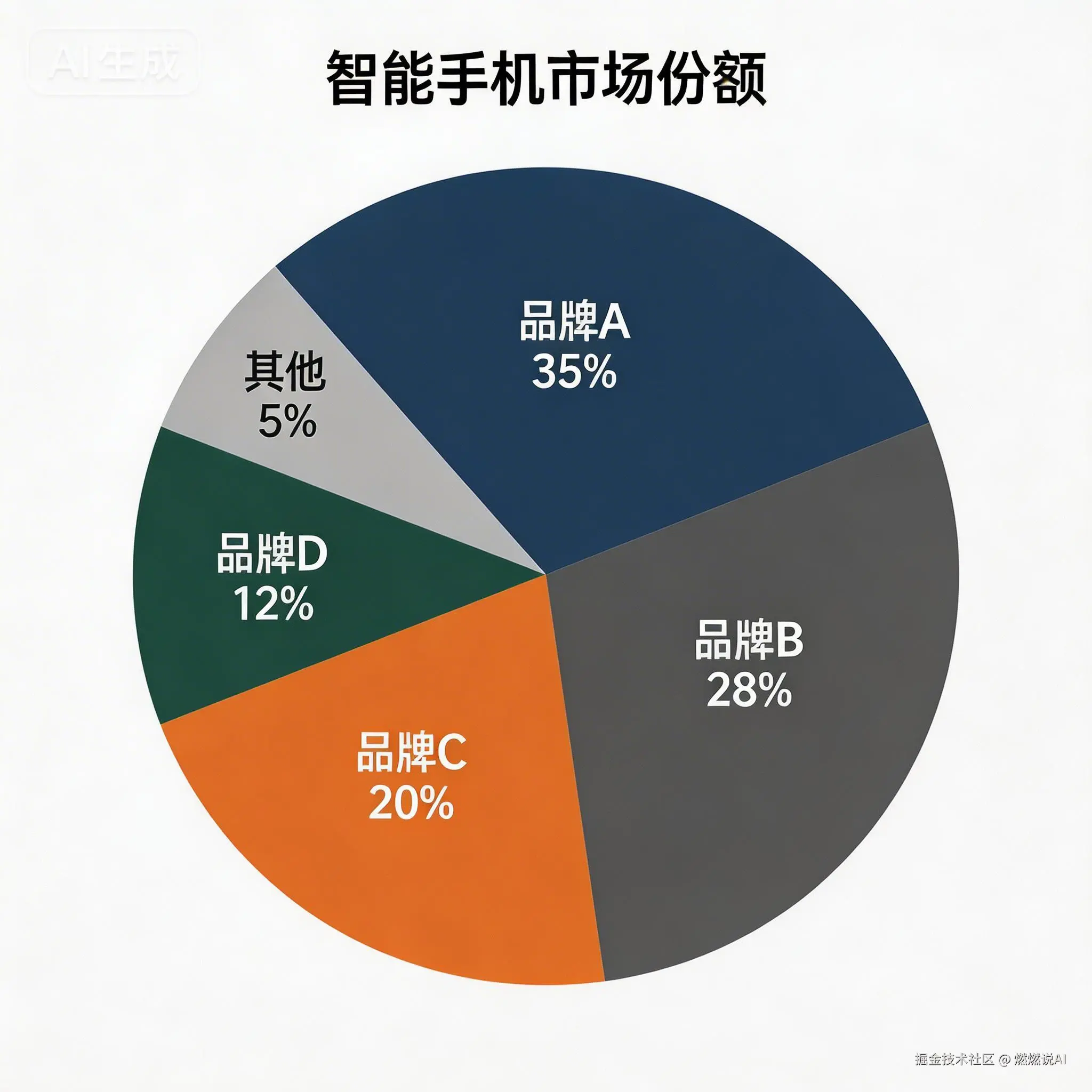 生成的饼图比例准确,35%、28%、20%、12%、5%的大小关系完全正确。品牌A作为最大份额放在12点方向,所有百分比标签清晰可见。即梦AI在数据可视化领域处于领先地位。