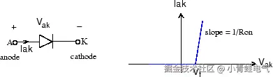二极管是一种由其自身电压 Vak 和电流 Iak 控制的半导体器件。当二极管正向偏置(Vak > 0)时,它开始导通,其两端有一个小的正向电压 Vf。当流入器件的电流变为 0 时,它关断。当二极管反向偏置(Vak < 0)时,它保持在关断状态。