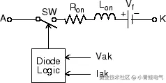 二极管模块通过一个电阻、一个电感、一个直流电压源和一个开关串联来模拟。开关操作由电压 Vak 和电流 Iak 控制。