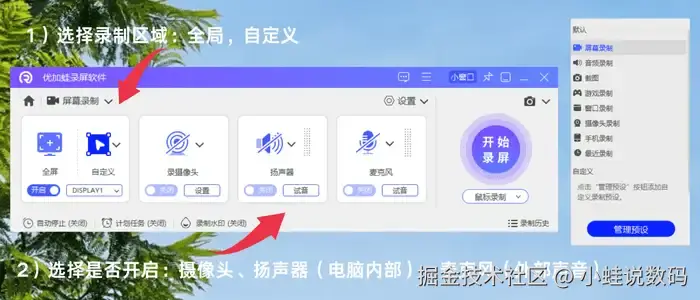 Windows录屏功能保存在哪里?如果你的预算不充裕,或者只需要基础的录屏功能,免费录屏软件完全能满足日常多数使用场景,不用纠结付费问题,也无需顾虑功能上的限制。优加蛙录屏作为免费录屏领域的标杆之作,兼容绝大多数主流操作系统,既能实现无水印的全屏、区域或窗口录制,还拥有出色的多源混排功能,能灵活搭配摄像头画面、文本、图像等元素,甚至支持直接推流到各大直播平台,是游戏直播和专业内容创作的优质免费选择。只是它的设置界面比较复杂,新手需要花点时间熟悉操作方式。