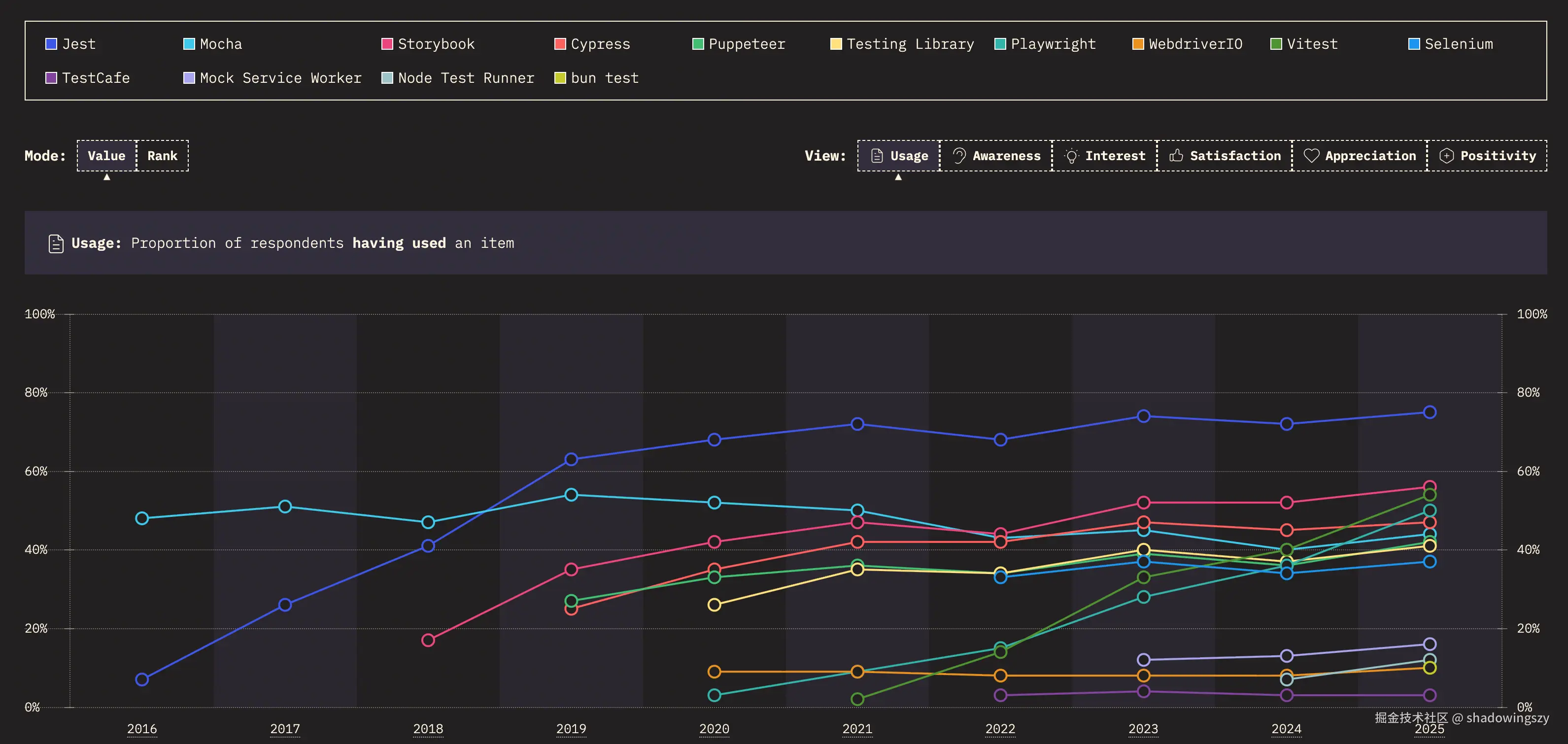 - 在单元与集成测试层面,Jest 以 75% 的使用率独占鳌头。
