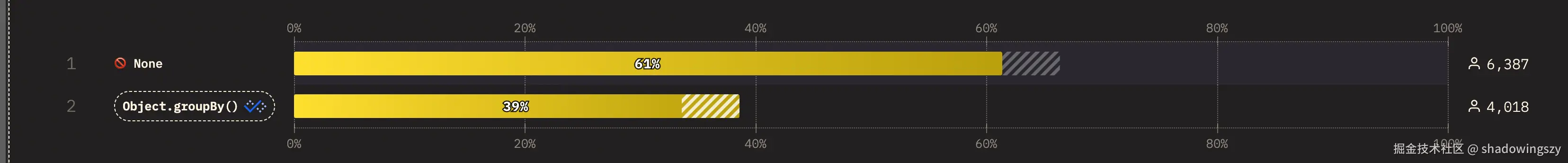 Object.groupBy()拿到 39% 使用率,说明了“按字段分组”这类高频需求可以摆脱 Lodash 等库,直接靠原生 JS 优雅解决。