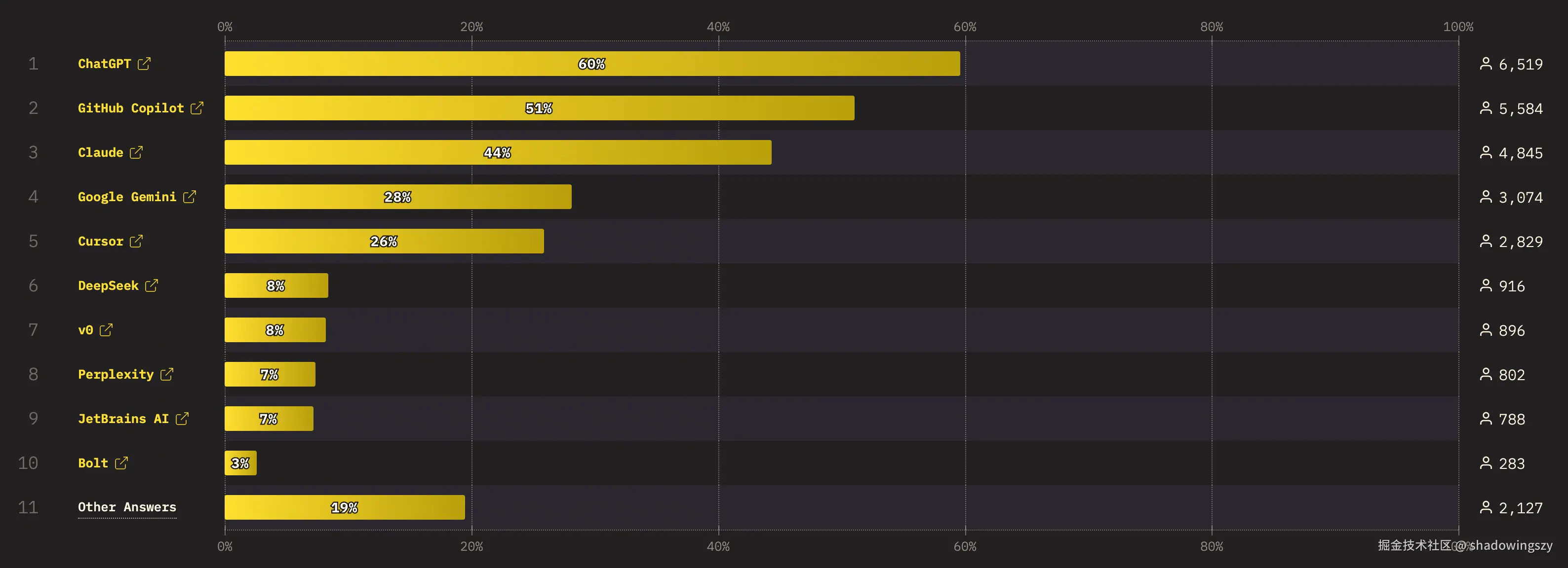 - ChatGPT 以 60% 的使用率位居首位,承担了问答、代码草稿生成、调试思路辅助等“外脑”角色。