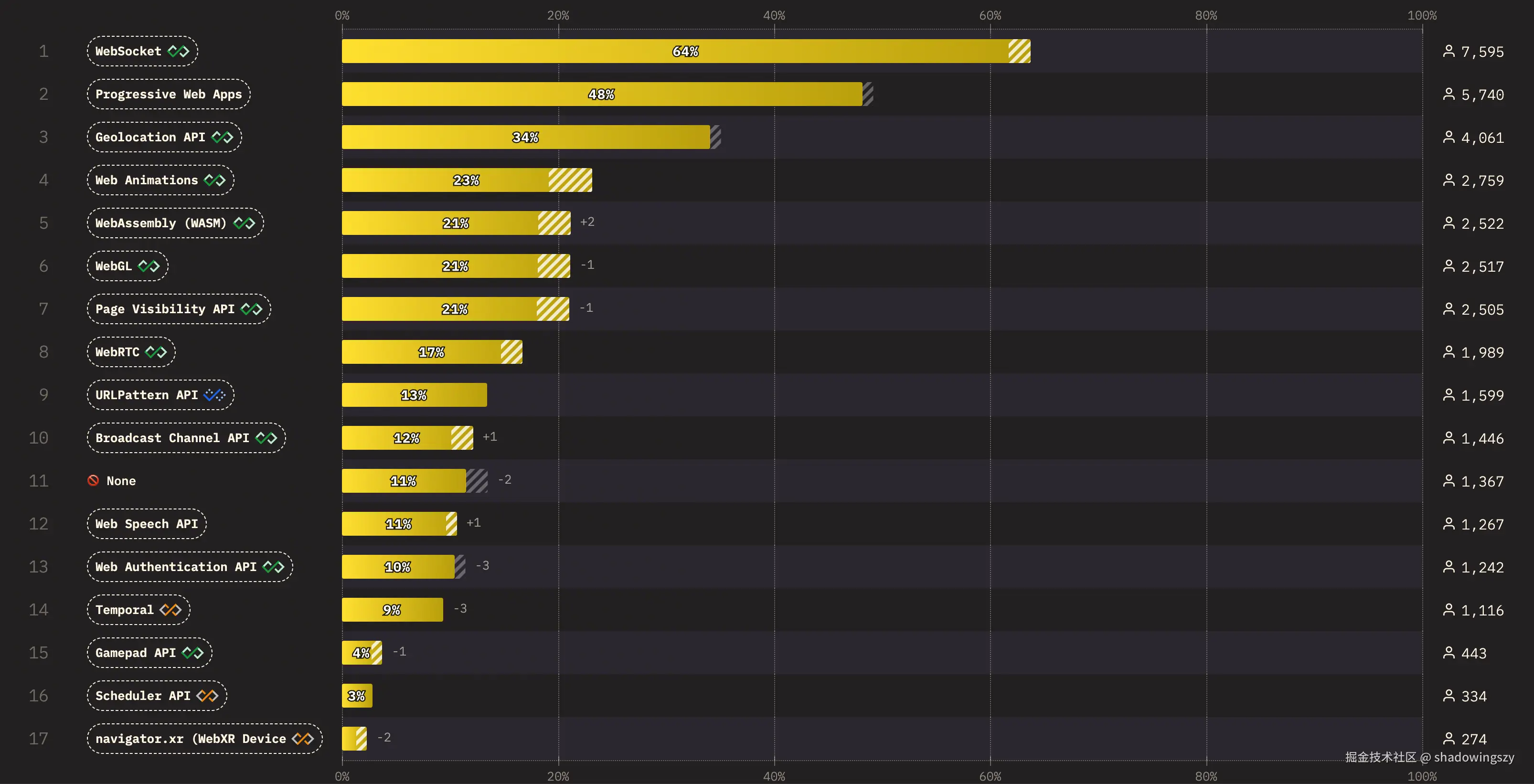 浏览器 API 的使用情况反映了 Web 应用能力正从传统的页面展示,向功能更丰富、更接近原生应用的形态演进: