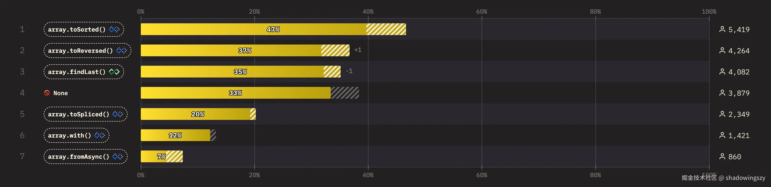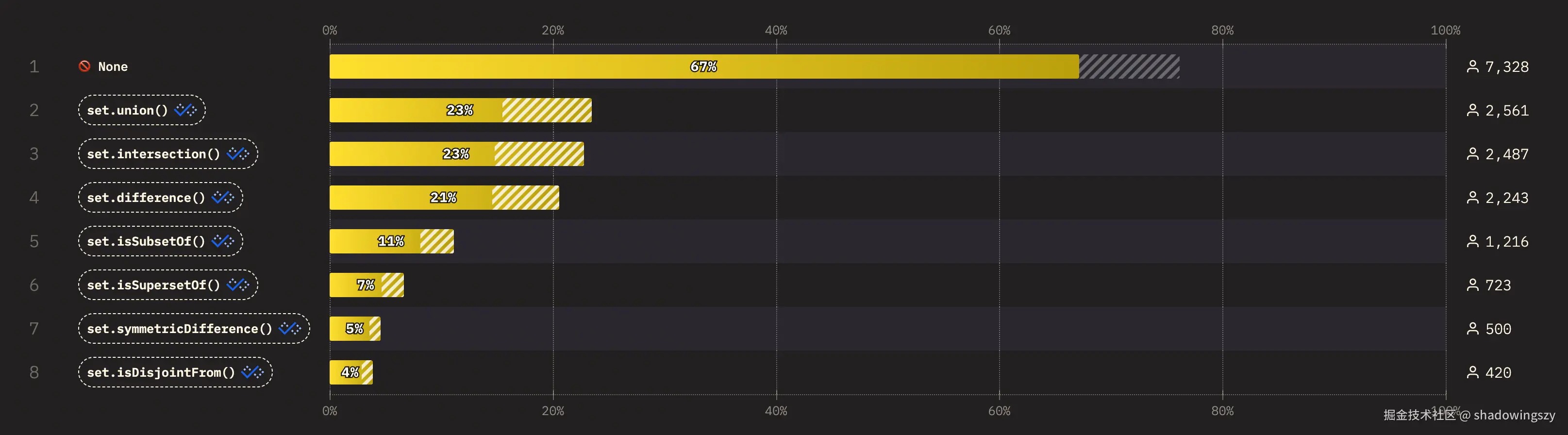 toSorted()使用率已达 47% ,其孪生兄弟toReversed()也达到 37% ,说明社区正主动避免原地修改数组带来的副作用。 Set新方法整体普及度不高,但在使用者中union()、intersection()、difference()等集合运算需求最集中,开始用于表达更复杂的数据关系与权限逻辑。- 首次进入调查的