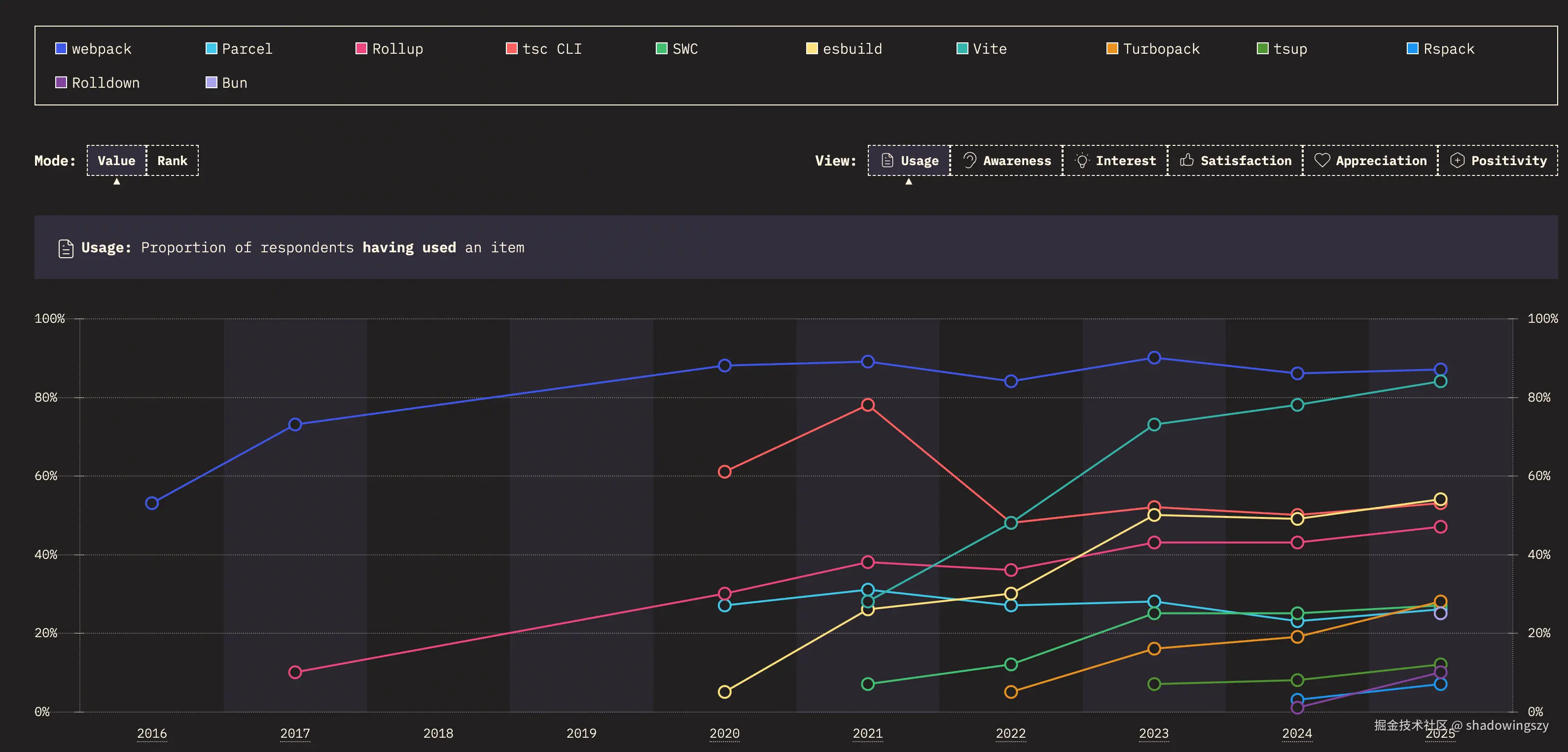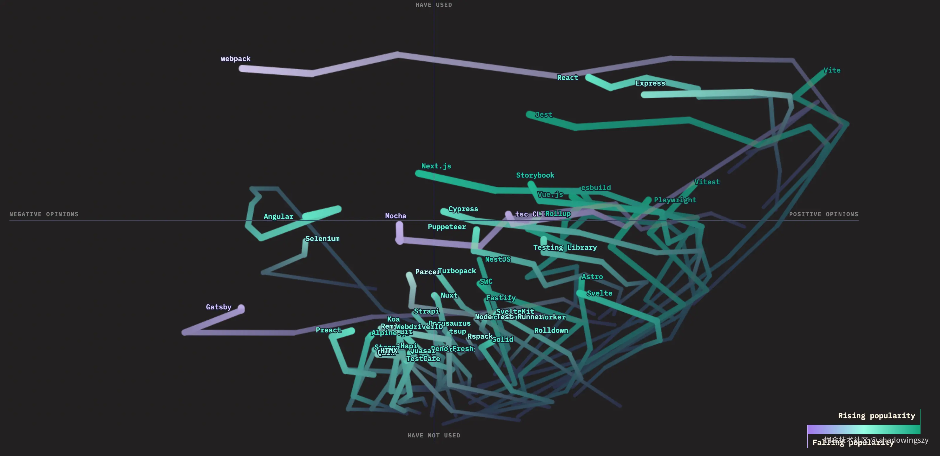 - 左侧四象限清晰展示出以 Vite 为代表的新一代工具,正沿着“低使用、高满意度”向“高使用、高满意度”高速跃迁,而曾经的王者 webpack 虽然仍有庞大使用量,但满意度明显滑落且轨迹线转为紫色,显示出疲态