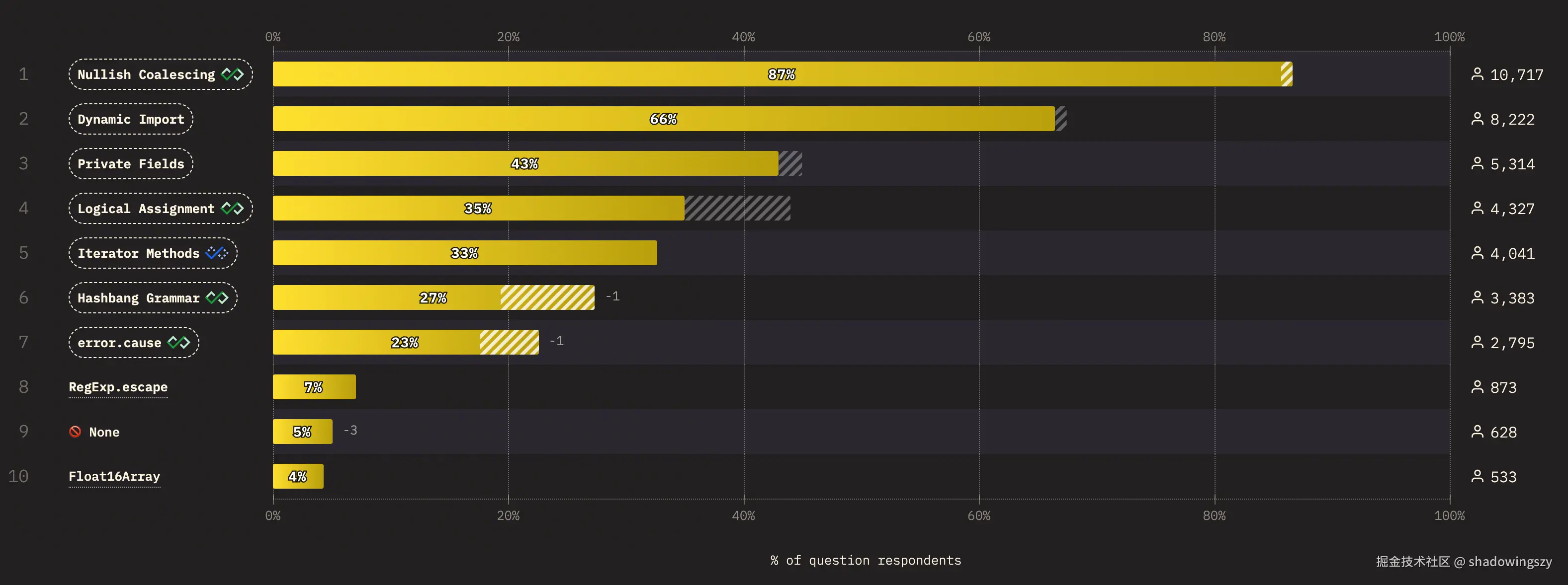 Dynamic Import) 以 66% 的使用率紧随其后,反映出代码分割和按需加载已是现代 Web 应用性能优化的核心实践,在构建大型应用、特别是需要考虑首屏加载速度的场景时,动态导入几乎是必修课。 - 类私有字段(
