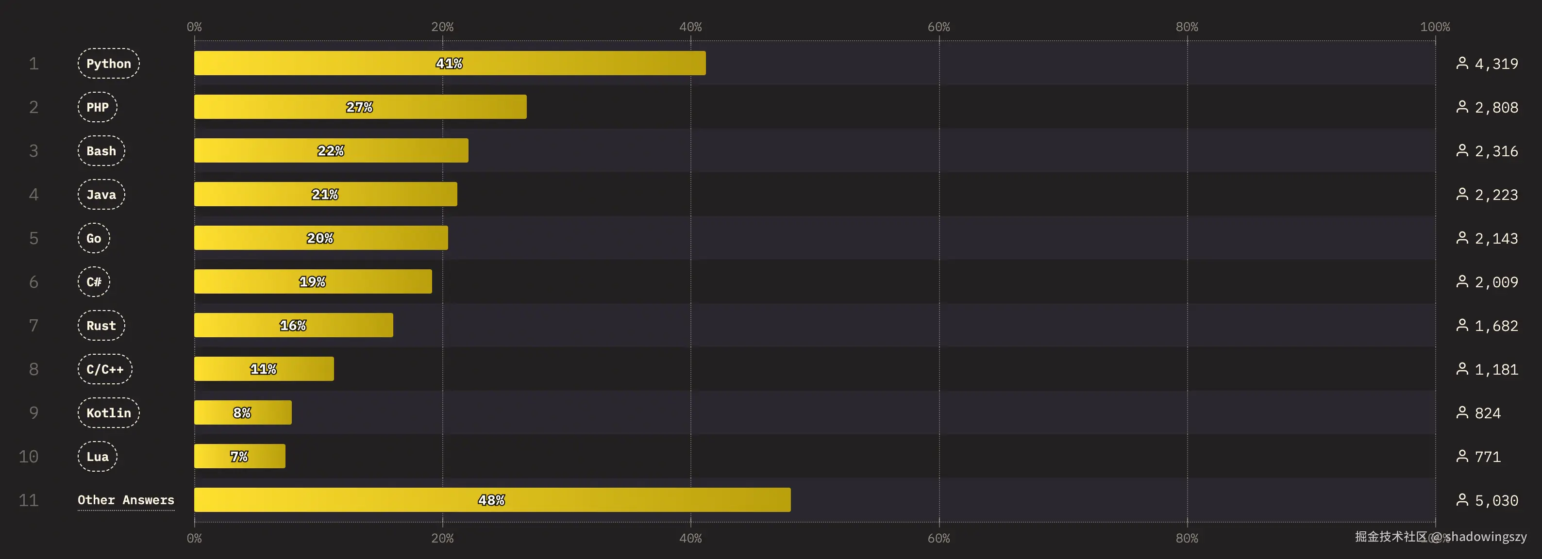 - PHP (27%) 的存在感说明不少人仍在使用 Web 传统栈构建项目或是在维护古老的历史项目。
