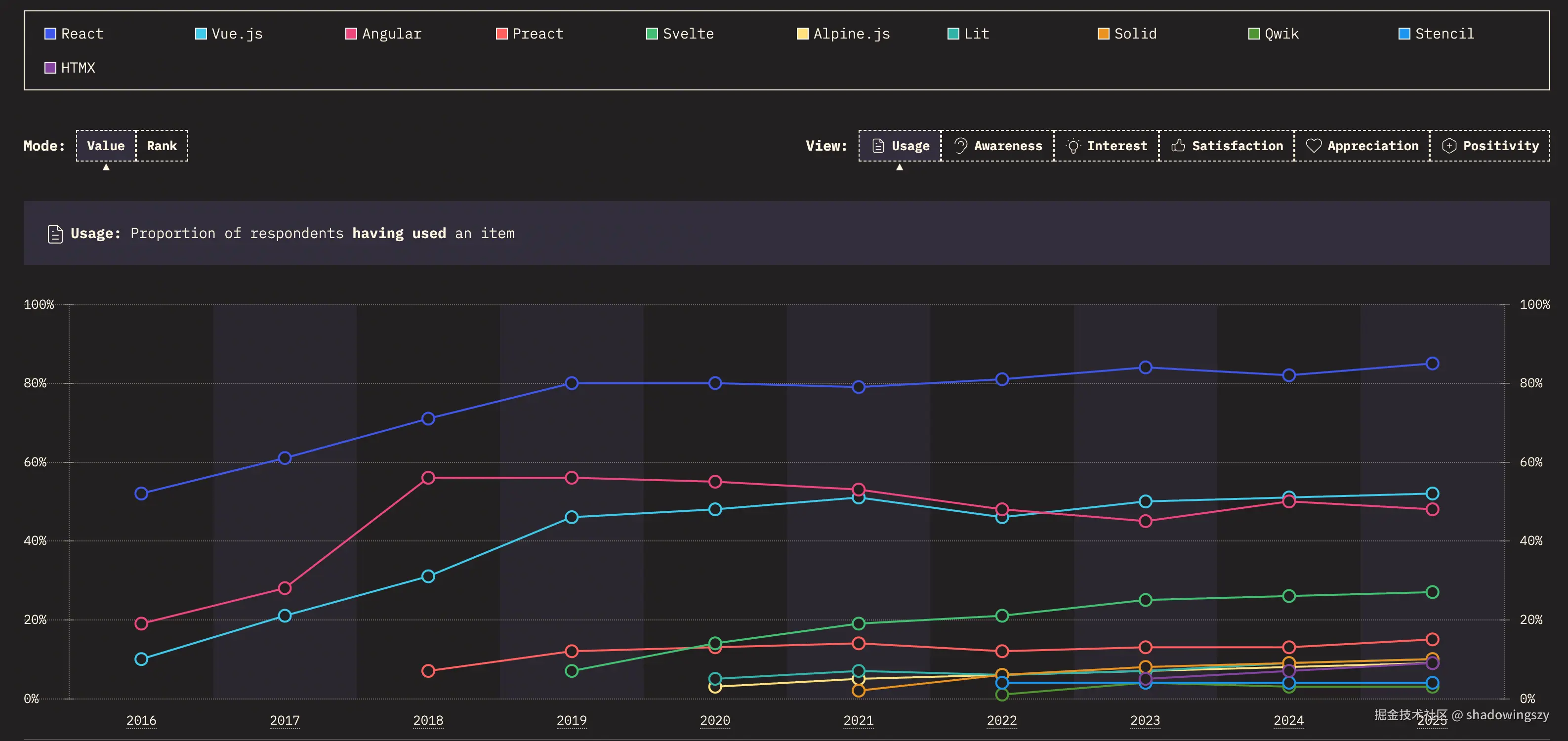 - 更有意思的是 HTMX,在近两年实现爆发式增长、使用率来到 13% ,它用“回归 HTML、用属性驱动交互”的思路,对当下 JS-heavy 的前端栈提出了有力反思。