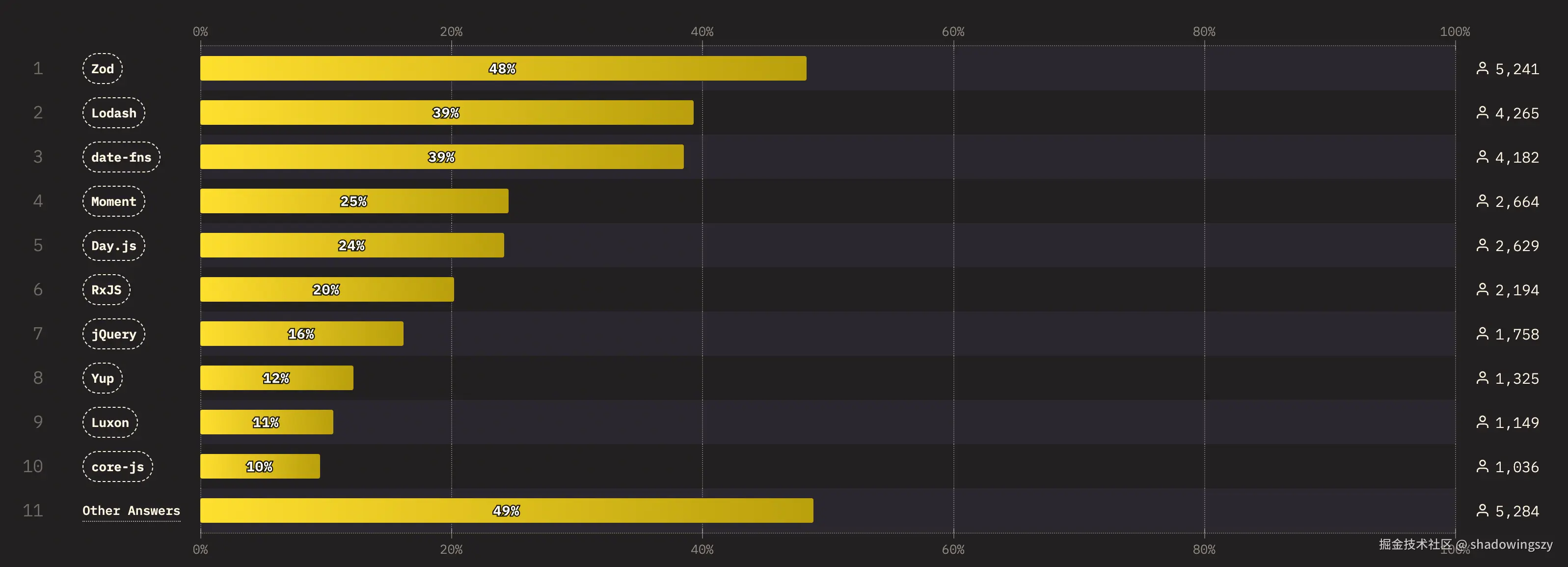 - 传统工具库 Lodash (39%) 依然宝刀不老,仍在大量项目中承担通用数据处理职责。