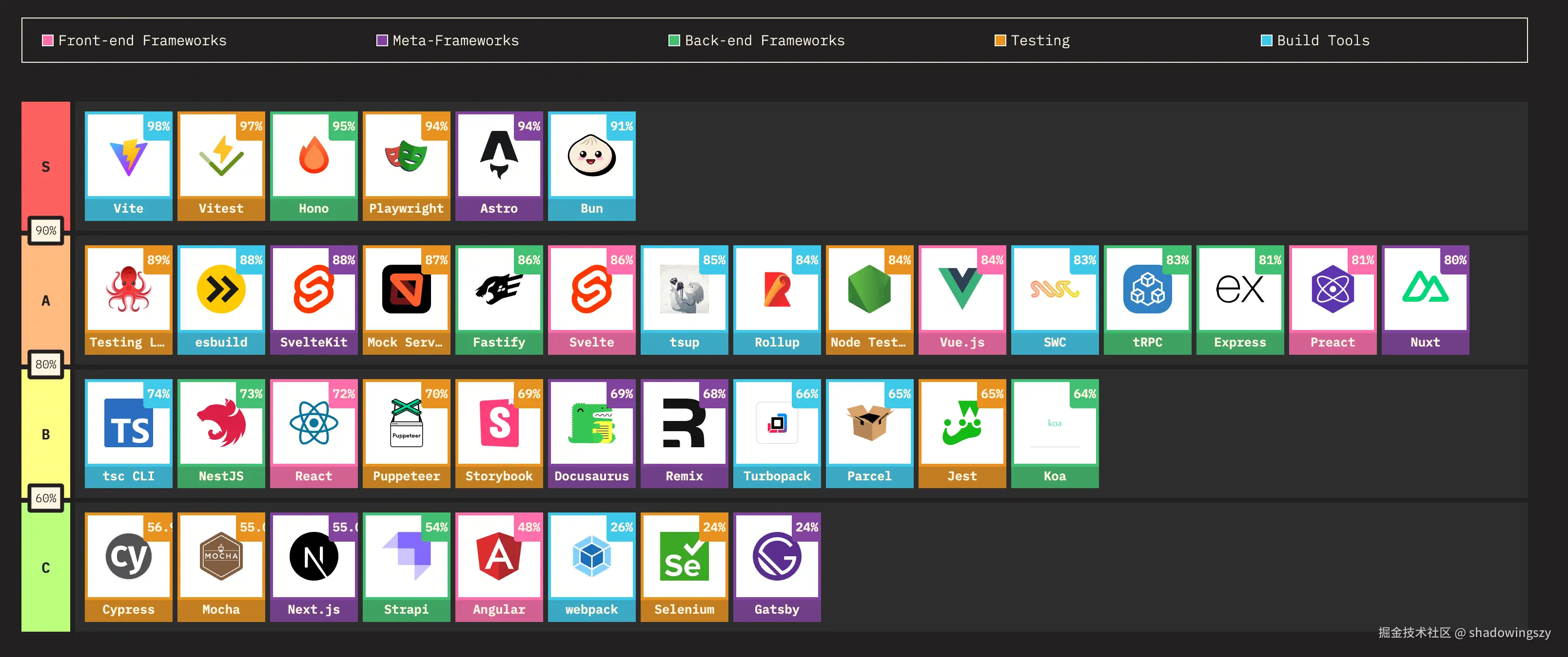 - 端到端测试领域则被 Cypress (55%) 和 Playwright (49%) 两强主导,其中 Playwright 以 94% 的满意度跻身 S 级,体现了其在稳定性、调试体验和多浏览器支持上的优势。
