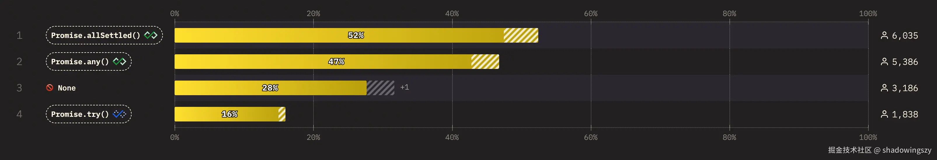 Promise.allSettled()以 52% 的使用率登顶,适合在“批量请求但不希望单点失败拖垮整体流程”的场景下使用,例如并行拉取多个非关键数据源、日志或埋点结果,它能保证我们总能拿到每个 Promise 的最终状态。Promise.any()使用率也达到 47% ,是“抢最快一个结果”的利器,典型场景是对多个镜像服务发起并行请求、谁先返回就用谁,从而显著优化响应延迟。- 这两个 API 的走红说明前端异步模型已经从“能并发”走向“可编排”,开发者不再满足于简单的