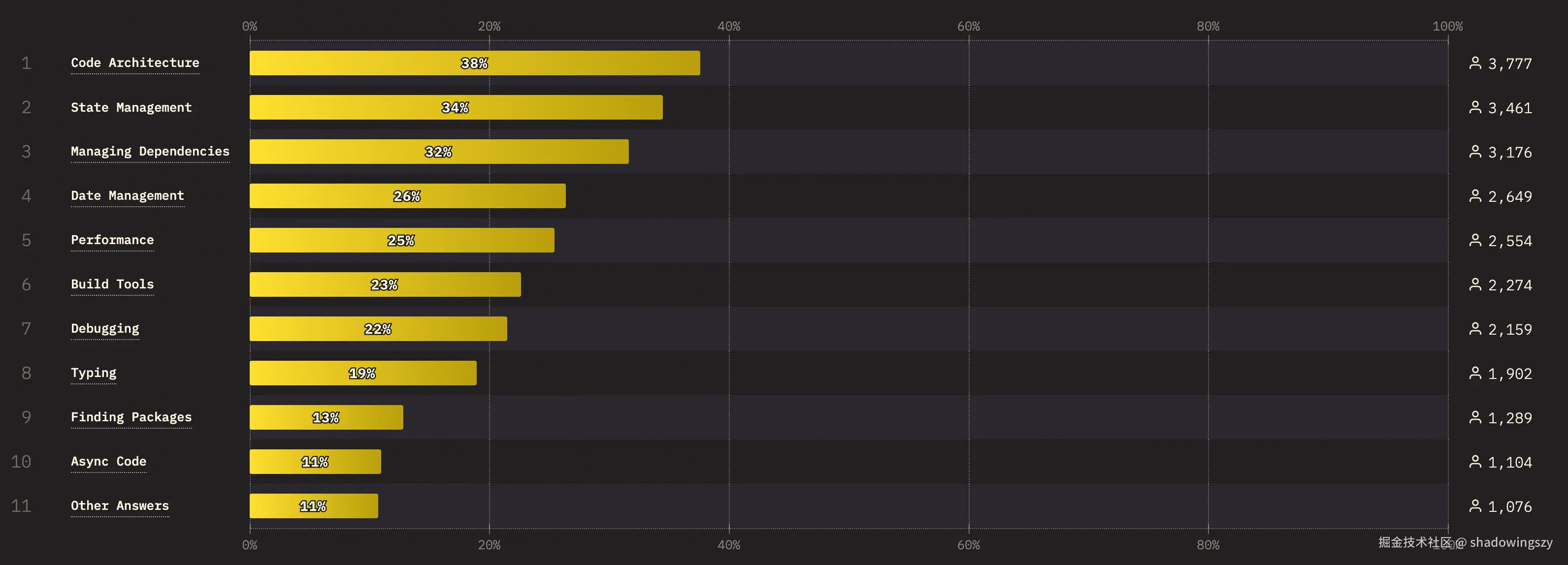 - 代码架构(Code Architecture) 以 38% 的提及率高居榜首,说明随着前端项目体量和生命周期不断拉长,如何拆分模块、划分边界、治理依赖、避免“屎山”成为最大挑战。