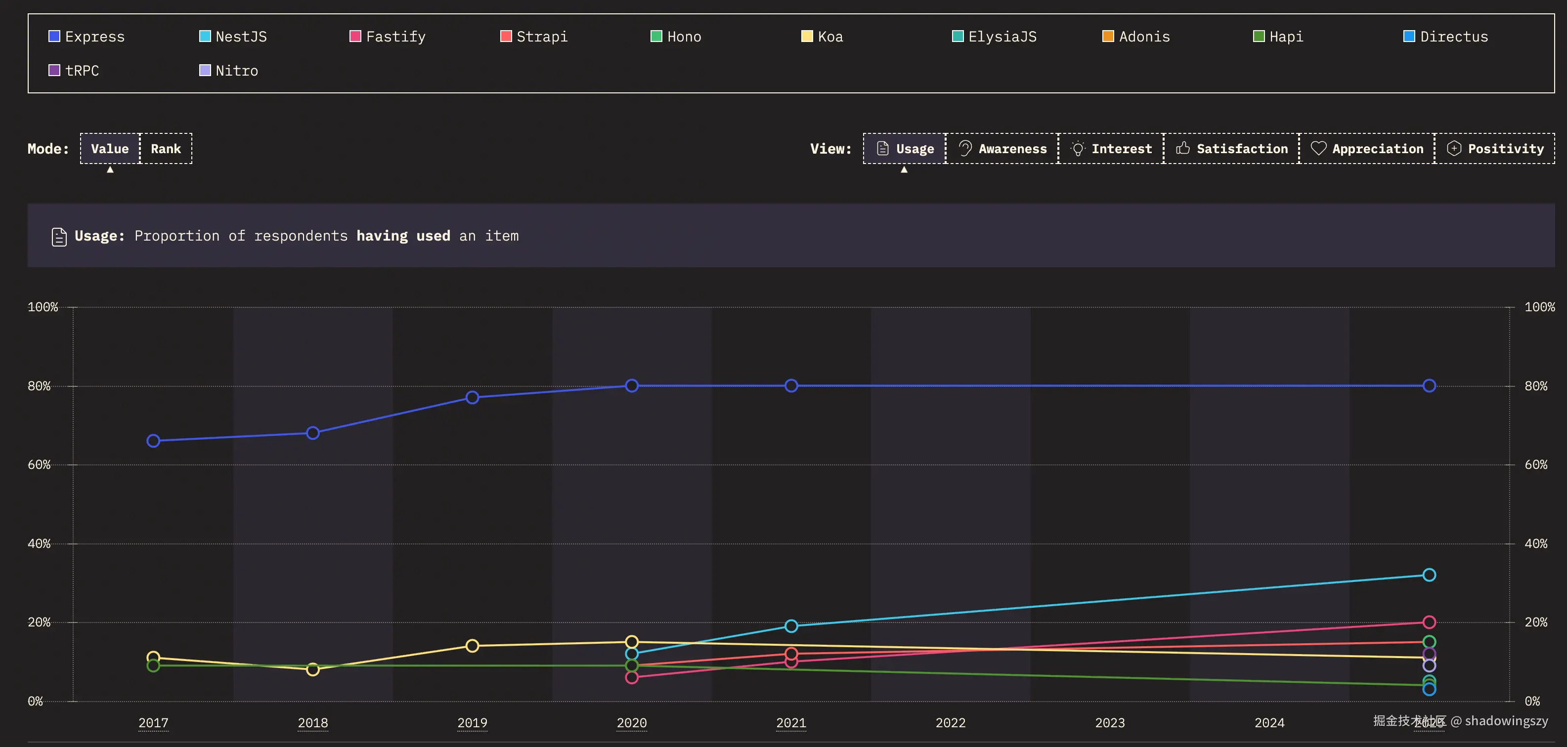 这两张图分别从“历史趋势”和“当前满意度”两个维度,为我们描绘了 JS 技术生态的全景图: