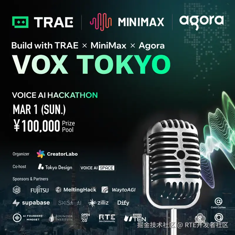 这是一场聚焦社会课题解决的线下黑客松。我们邀请开发者、创业者和创意人才齐聚川崎,利用 TRAE 的高效开发能力、MiniMax 的自然语音合成,以及 Agora 的实时交互技术,在 8 小时内做出一个能 Demo 的语音 AI Agent 原型。新手也欢迎,现场有人一起 vibe coding,餐饮饮料都安排好,你只要带电脑 + 一个点子来就行。