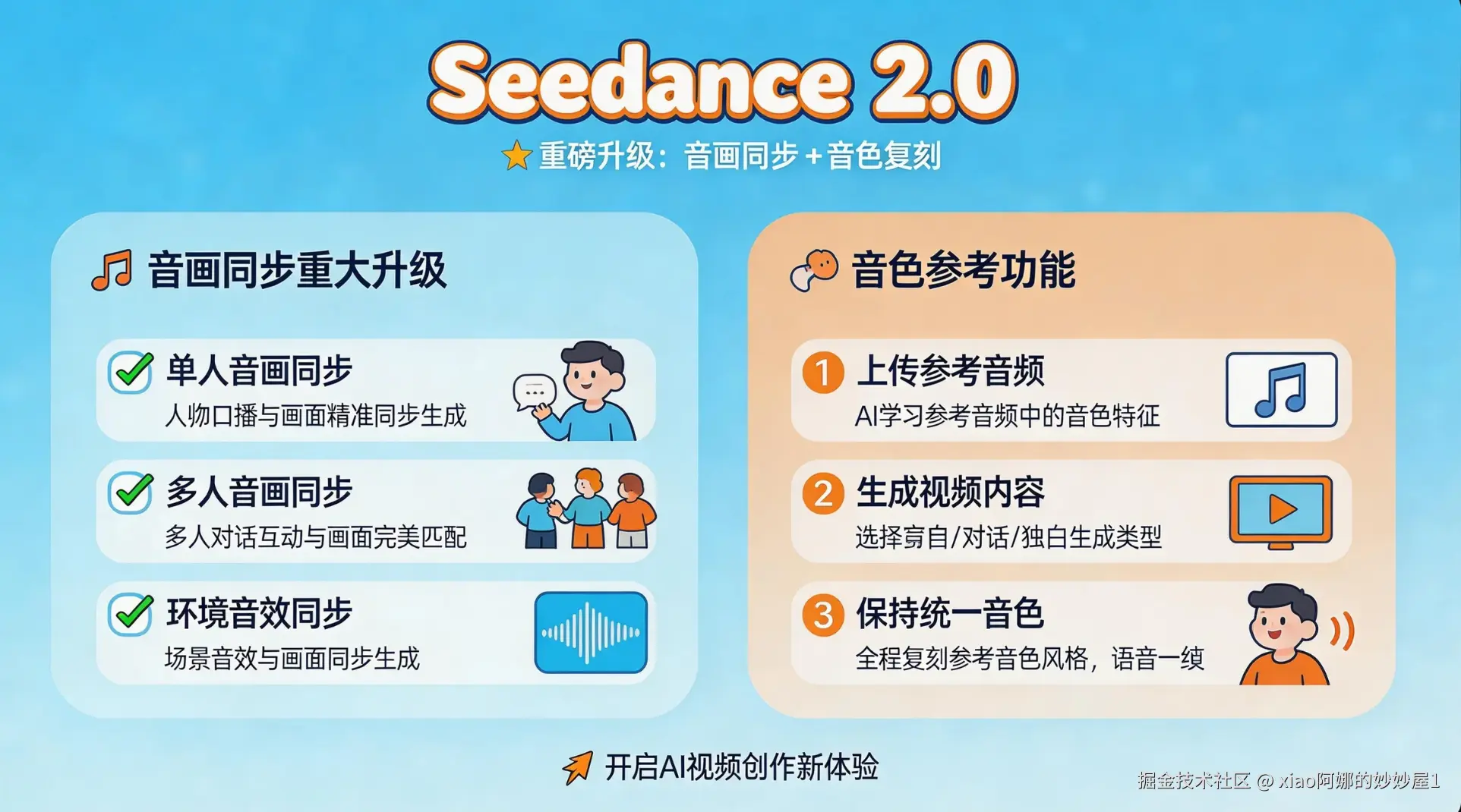 Seedance 2.0在音画同步上也做了重大升级,支持单人、多人音画同步,人物口播、环境音效与画面同步生成。