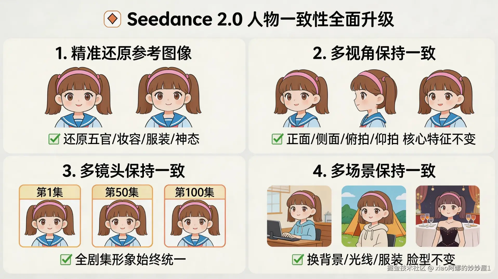 Seedance 2.0在人物一致性上做了全面升级,位居同类型产品 Top 级别。