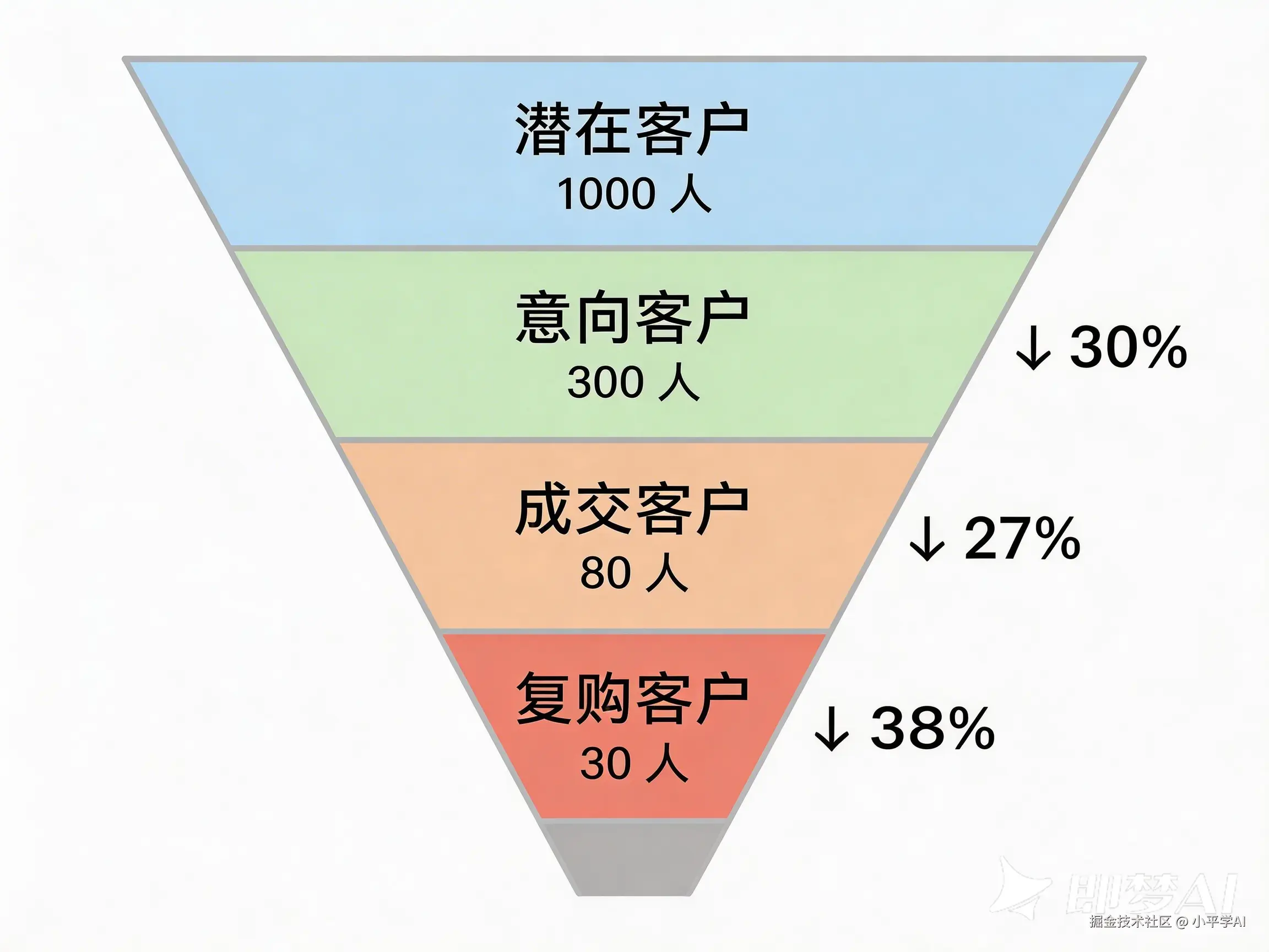 右侧标注转化率箭头,风格为扁平化商务风,逻辑结构清晰。”