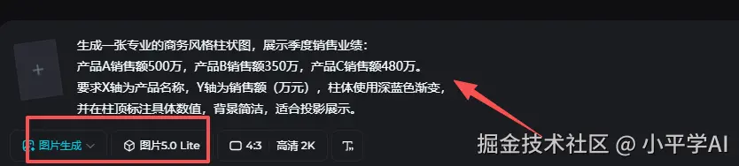 Seedream 5.0 完美还原了数据,三个产品的柱状高度比例精准,