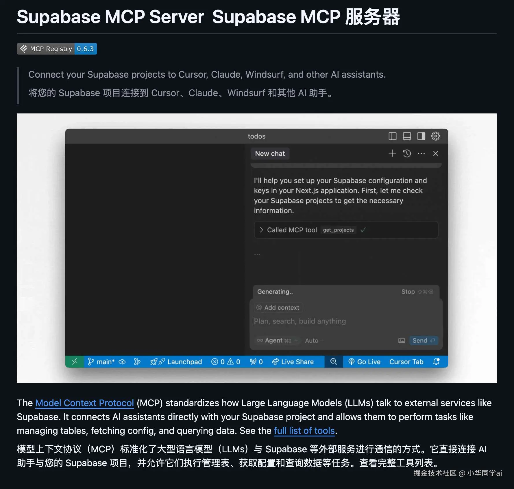 supabase-mcp 是一个基于 Model Context Protocol(MCP)的 Supabase 连接器/服务器,让 Cursor、Claude、Windsurf 等 AI 助手能在授权后直接“操作你的 Supabase 项目”:例如查询数据、管理表结构、读取配置与文档,并按需启用数据库、调试、函数、存储、分支等工具组。它支持通过 URL 参数开启 read_only 只读模式、用 project_ref 将权限限定到单一项目,并可用 features 精细控制可用能力,便于在安全边界内把 AI 接入真实后端工作流。