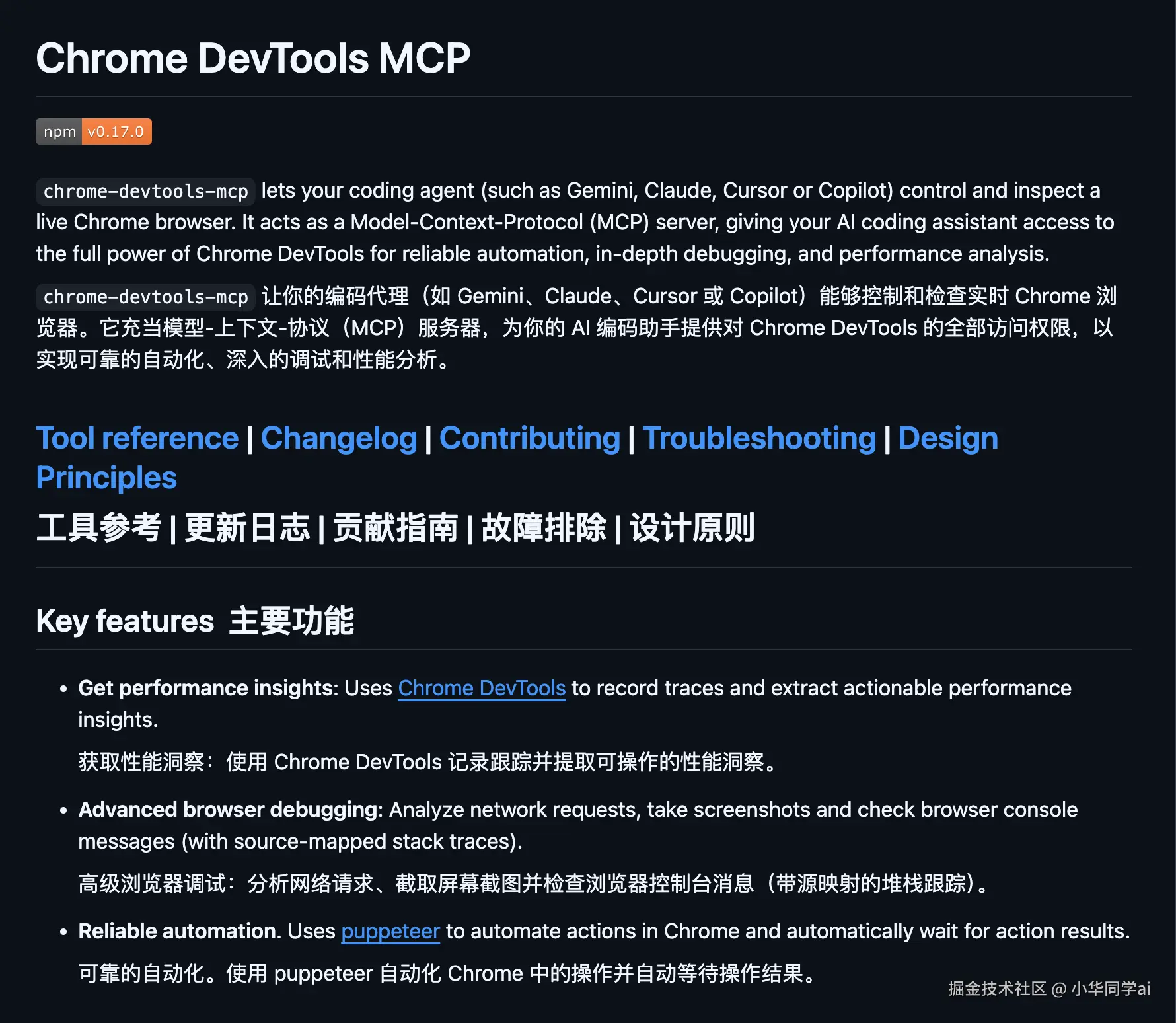ChromeDevTools/chrome-devtools-mcp 是一个 Model Context Protocol(MCP)服务器,把“真实运行中的 Chrome + DevTools 能力”开放给各类 AI 编程助手(如 Claude、Cursor、Copilot、Gemini 等),让代理不再“盲写代码”。它可通过 DevTools/Chrome DevTools Protocol 获取并分析 性能 Trace、网络请求、控制台日志(含 source map 堆栈)、截图等信息,并结合 Puppeteer 做更可靠的页面自动化与结果等待,从而实现自动验证改动、定位前端问题、做性能诊断与优化建议。支持用 npx 快速接入到 MCP 客户端,并提供关闭用量统计与 CrUX 相关查询的参数选项。
