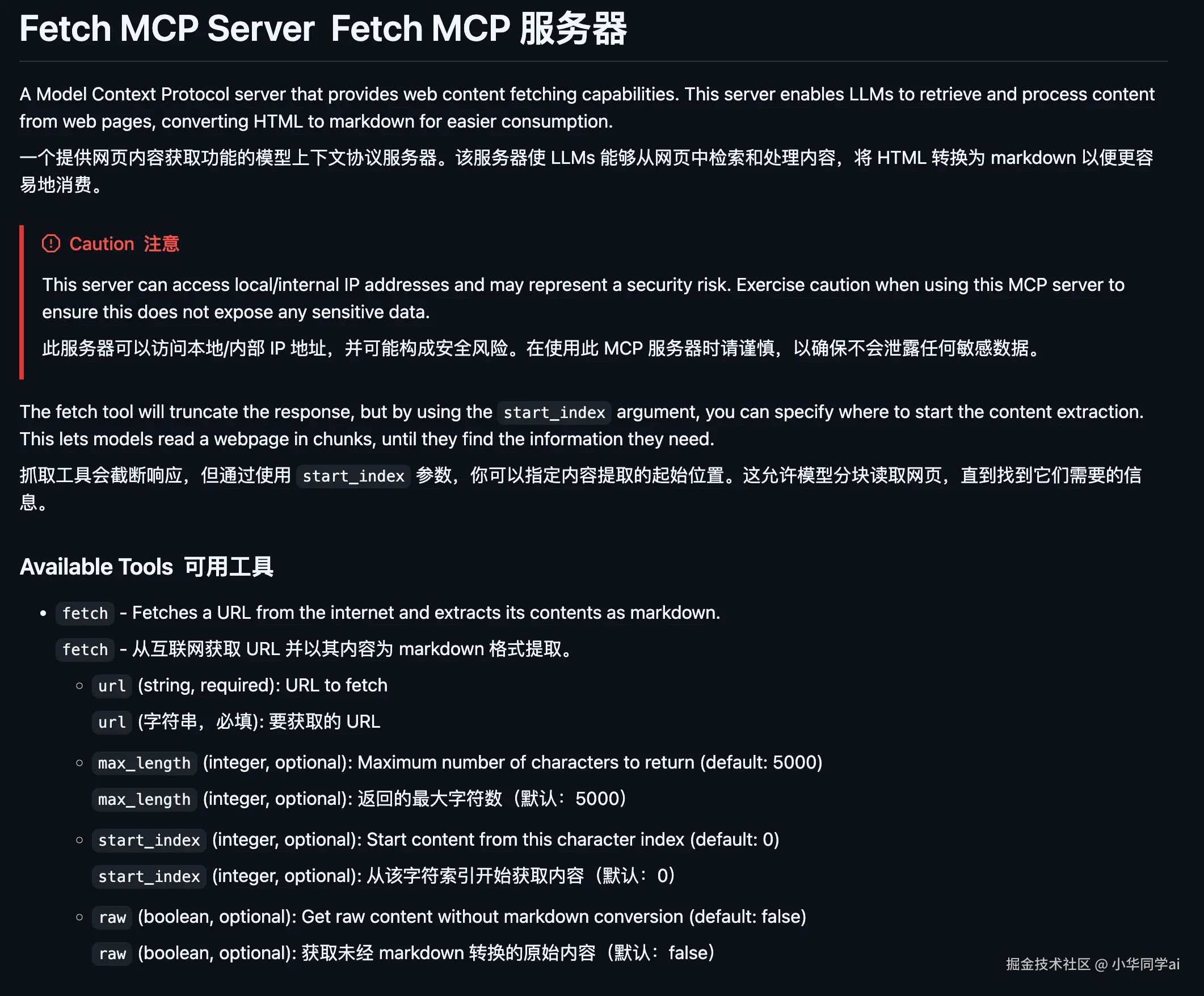 Fetch 是 modelcontextprotocol/servers 提供的参考级 MCP Server,面向大模型/智能体的“网页取数器”。它提供 fetch 工具:按 URL 抓取网页内容,并可将 HTML 自动清洗转换为更适合模型阅读的 Markdown;支持用 max_length 控制返回长度、用 start_index 分段续读,便于长文按块检索;默认遵守 robots.txt(模型工具调用时)、可自定义 User-Agent 与代理配置。由于可访问本地/内网 IP,需注意权限与数据泄露风险。