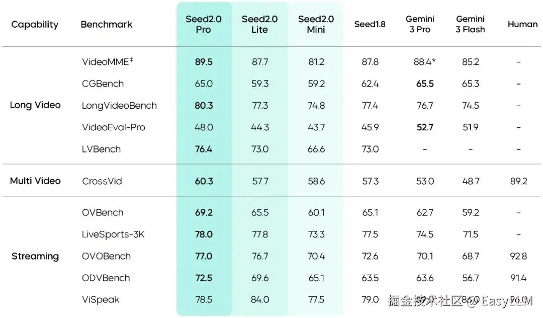 长视频场景中,官方称Seed2.0在大部分评测上超越了其他顶尖模型,此外,视频工具VideoCut进一步提高了长视频处理的时长范围,并提升了推理精度。同时,Seed2.0在多个流式实时问答视频基准测试中表现优异,能作为AI助手完成实时视频流分析、环境感知、主动纠错与情感陪伴。