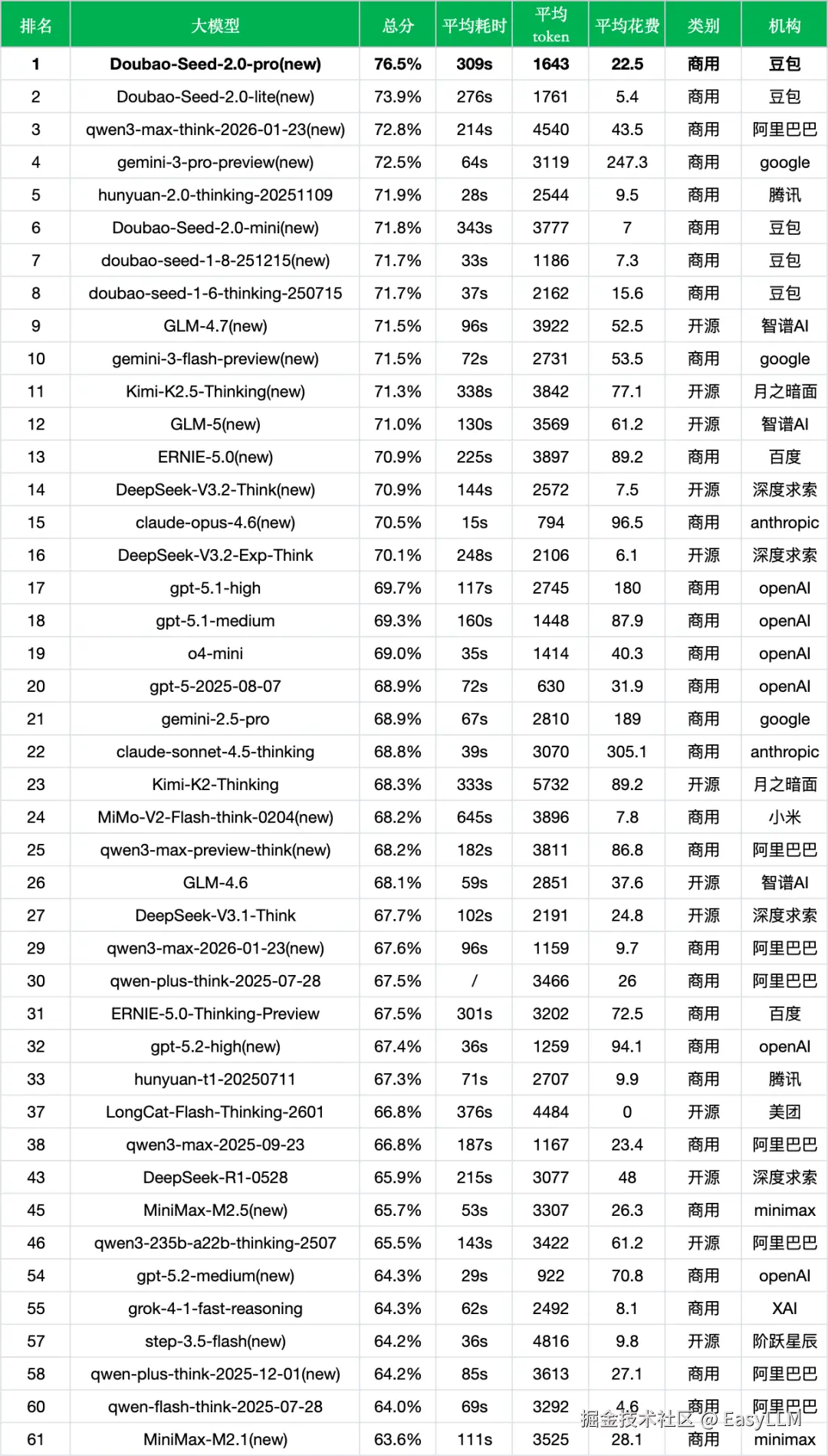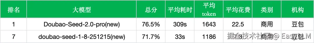 - 豆包家族矩阵成型:数据表明豆包已形成严密的产品矩阵。从旗舰级的 Seed-2.0-pro(76.5%),到平衡型的 Seed-2.0-lite(73.9%)和轻量级的 Seed-2.0-mini(71.8%),再到上一代的doubao-seed-1-8-251215(71.7%),覆盖了不同算力需求的用户群体。