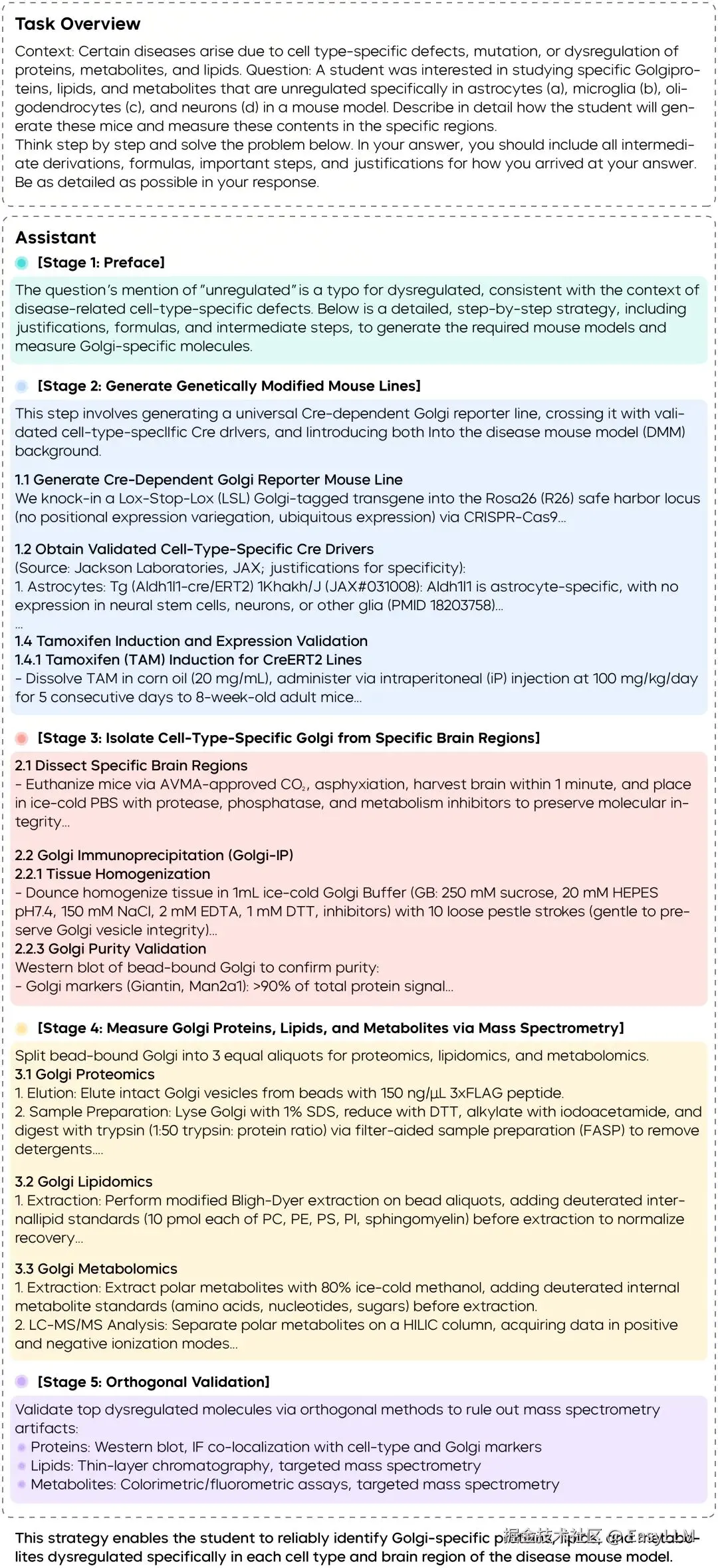 此外,Seed2.0还能把”研究想法”推进到”形成可落地的实验方案”。以高尔基体蛋白分析为例,它不仅能给出总体实验路线,还能把基因工程、小鼠模型构建、亚细胞分离与多组学分析串成一条完整流程,细化到关键环节怎么做、用什么进行对照以排除污染、用哪些指标评估纯度。