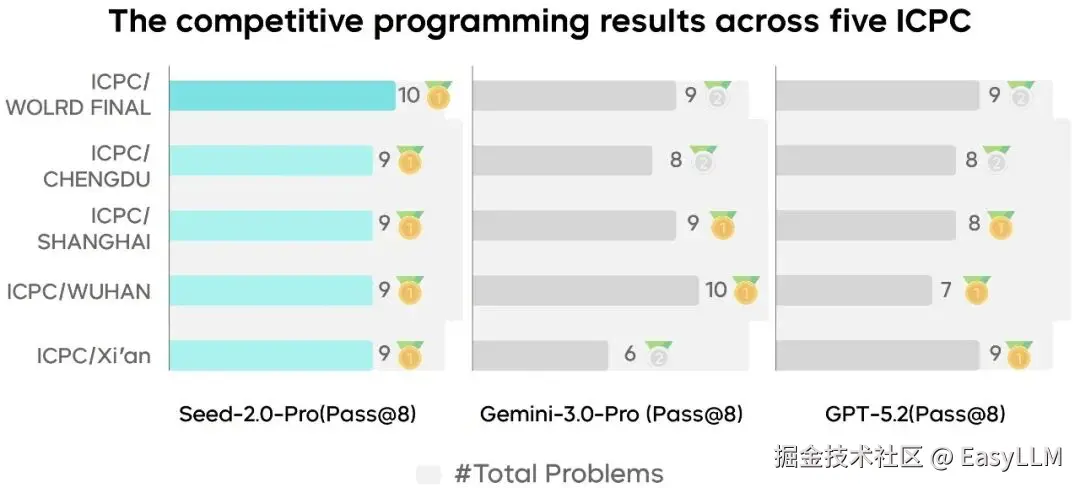 此外,Seed2.0 Pro在跨学科知识应用上的能力显著增强,其在FrontierSci等STEM基准测试中表现突出,部分场景得分超过Gemini 3 Pro。同时,Seed2.0 Pro在ICPC、IMO、CMO测试中均获得金牌成绩。