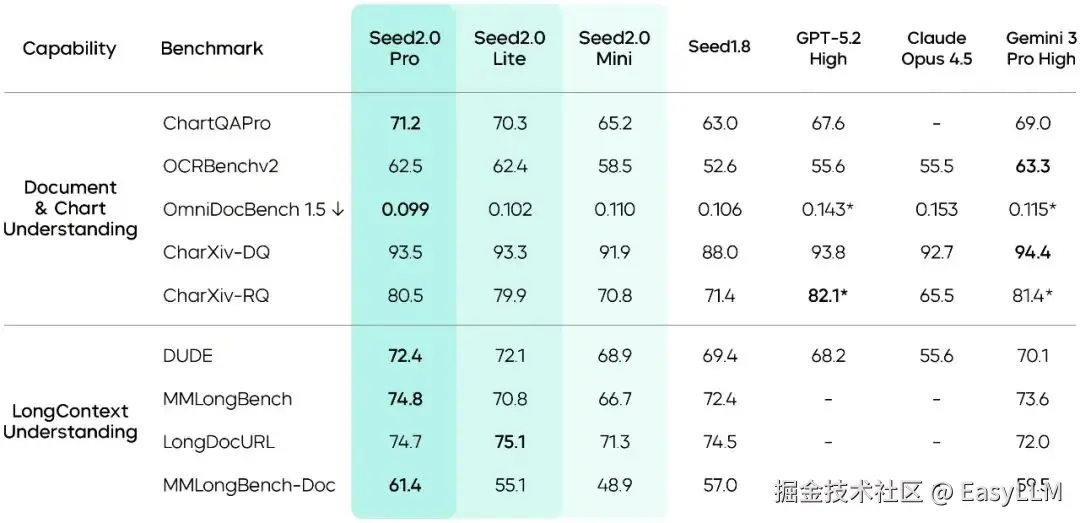 视觉理解基础能力的进步,让Seed2.0在真实应用场景中的表现大幅提升。相比Seed1.8,Seed2.0处理非结构化信息的能力显著强化,其在ChartQAPro与OmniDocBench 1.5基准上达到顶尖模型水准。同时,在长上下文理解方面,Seed2.0在DUDE、MMLongBench与MMLongBench-Doc上均取得业界最佳分数。