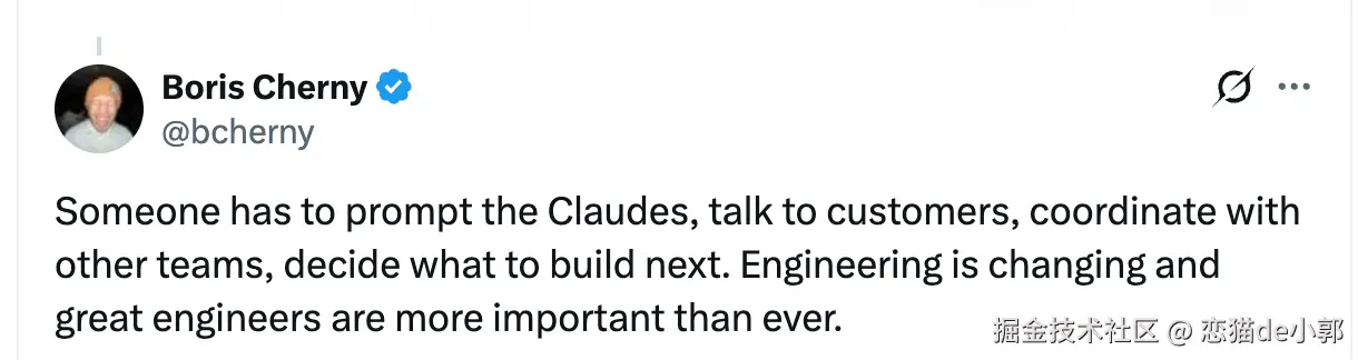 对此,Boris 的回应是:“ 总得有人去 prompt Claude、和客户沟通、与其他团队协调、决定接下来要做什么,工程正在发生变化,优秀的工程师比以往任何时候都更重要。”