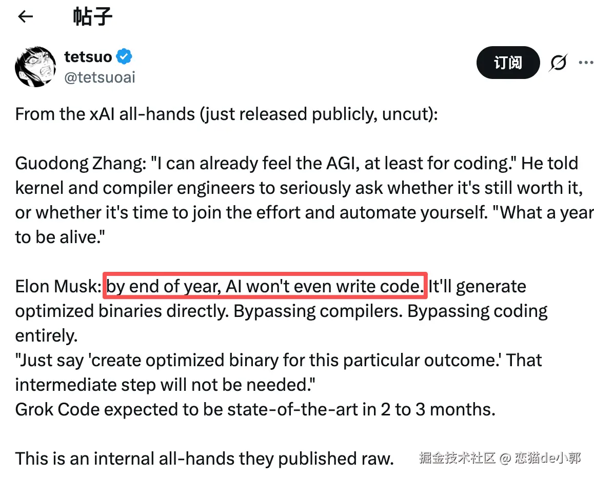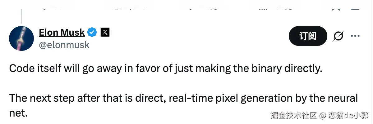 当然,对比起来,马斯克的观点则更激进:他认为代码这种中间过程可以被省略,未来应该是直接产出二进制,当然,直接生成优化后的二进制文件是 AI coding 的终极目标,但编译器的存在是因为验证很重要,因为瓶颈从来不是代码转二进制,而是精确地指定意图,使输出值得信赖的东西,因为你是在和概率为伍 。