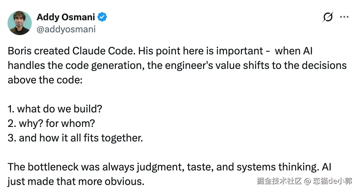而对于这个问题,Google AI 总监 Addy Osmani 也参与了讨论,他也支持 Boris 的观点,认为 AI 接管代码生成后,工程师的价值转移到更高层的判断、品味和系统思考上,例如: