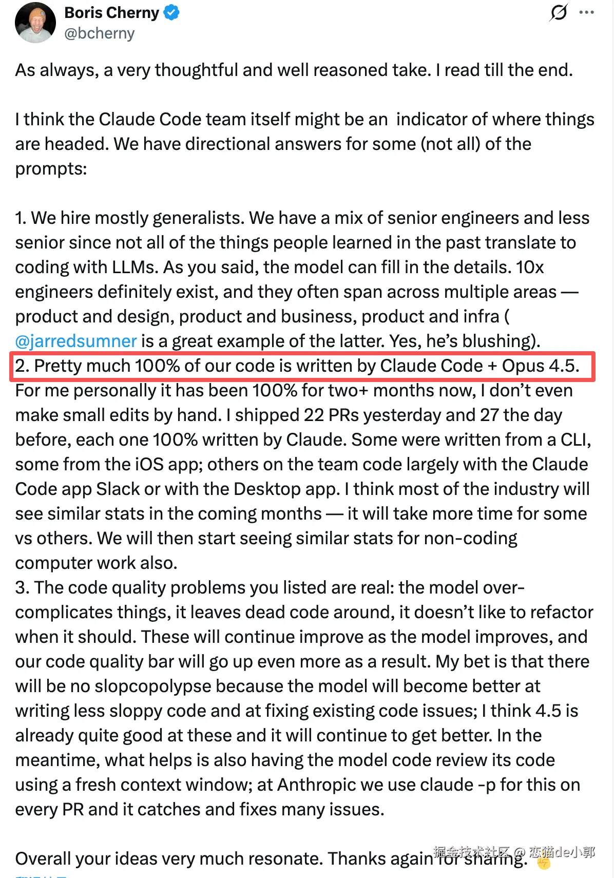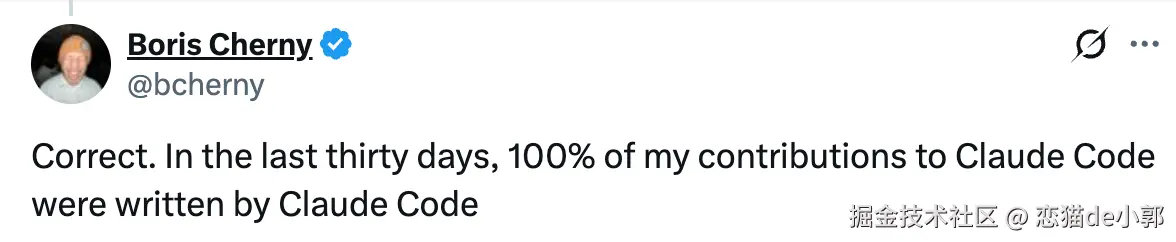 事情的起因来自 Anthropic 的创始人 Boris Cherny 这段时间活跃的动态,它多次在推文明确使用了 “100%” 这个表述来描述 Claude Code 在 Anthropic 内部的实际使用情况,所以也就有了开始的灵魂拷问: