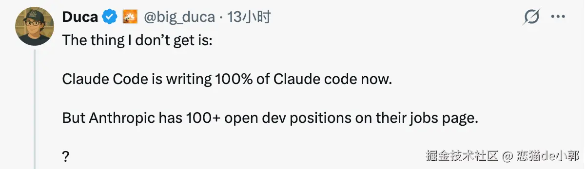 这是一个非常有意思的话题,近日有人对 Anthropic 发出了灵魂质问,既然 Claude Code 已经能 100% 自己给自己写代码,那么为什么 Anthropic 还有上百个工程师的岗位空缺: