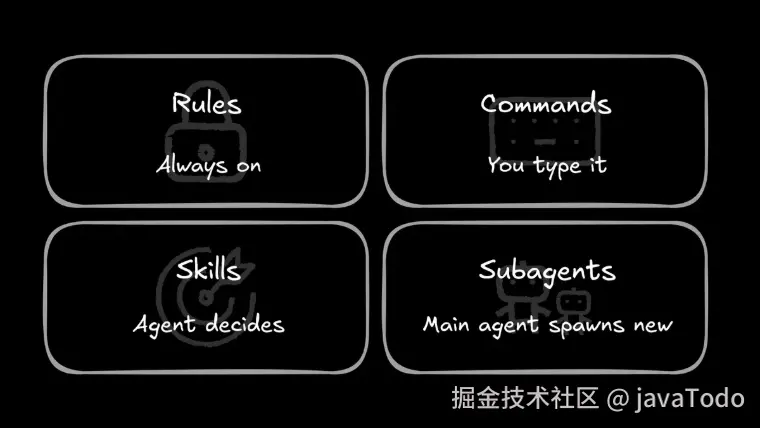 如果你想要一个清晰的心智模型,从 Agent 技能 vs 规则 vs 命令的分解开始。这里是你在构建时可以用的简短版本: