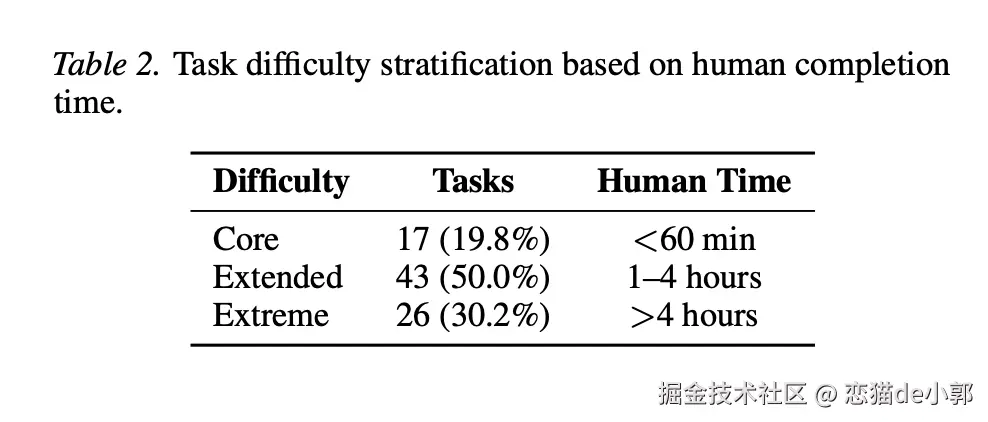 - Extreme:26 个任务(30.2%),人类完成时间 > 4 hours