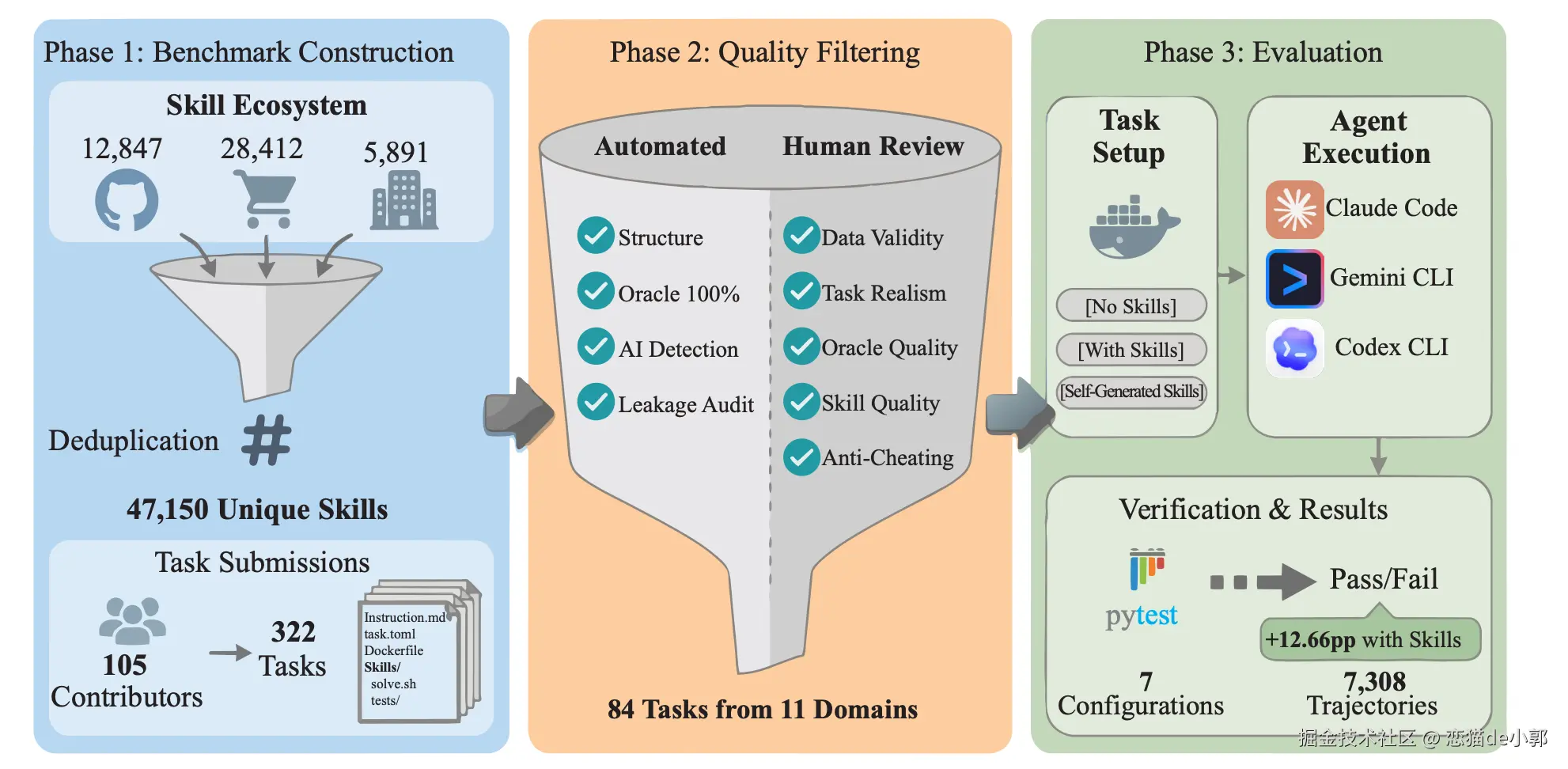 - 这个测试不是“手工写了几十个 demo”,而是从真实生态里抽样出一个很大的技能池 + 真实贡献者任务池
