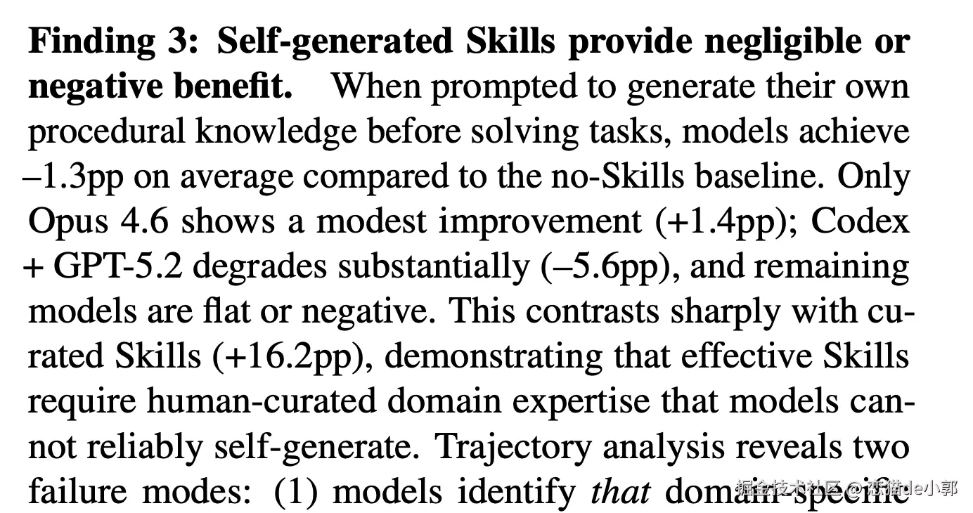 特别是 Curated Skills 包含有领域特定知识,比如在 failure analysis 里作者就说过 Self-generated 常见问题是:
