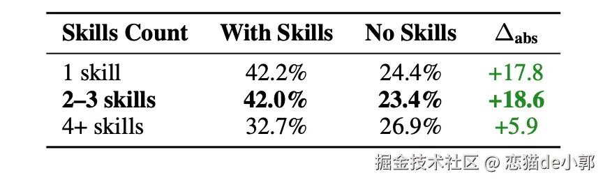 技能数量 2–3 个模块最好,太多反而拖累,按任务提供的 skill 数量分组 2–3 skills 的提升最大(+18.6pp) ,4 个以上提升很小,甚至可能带来认知负担/冲突