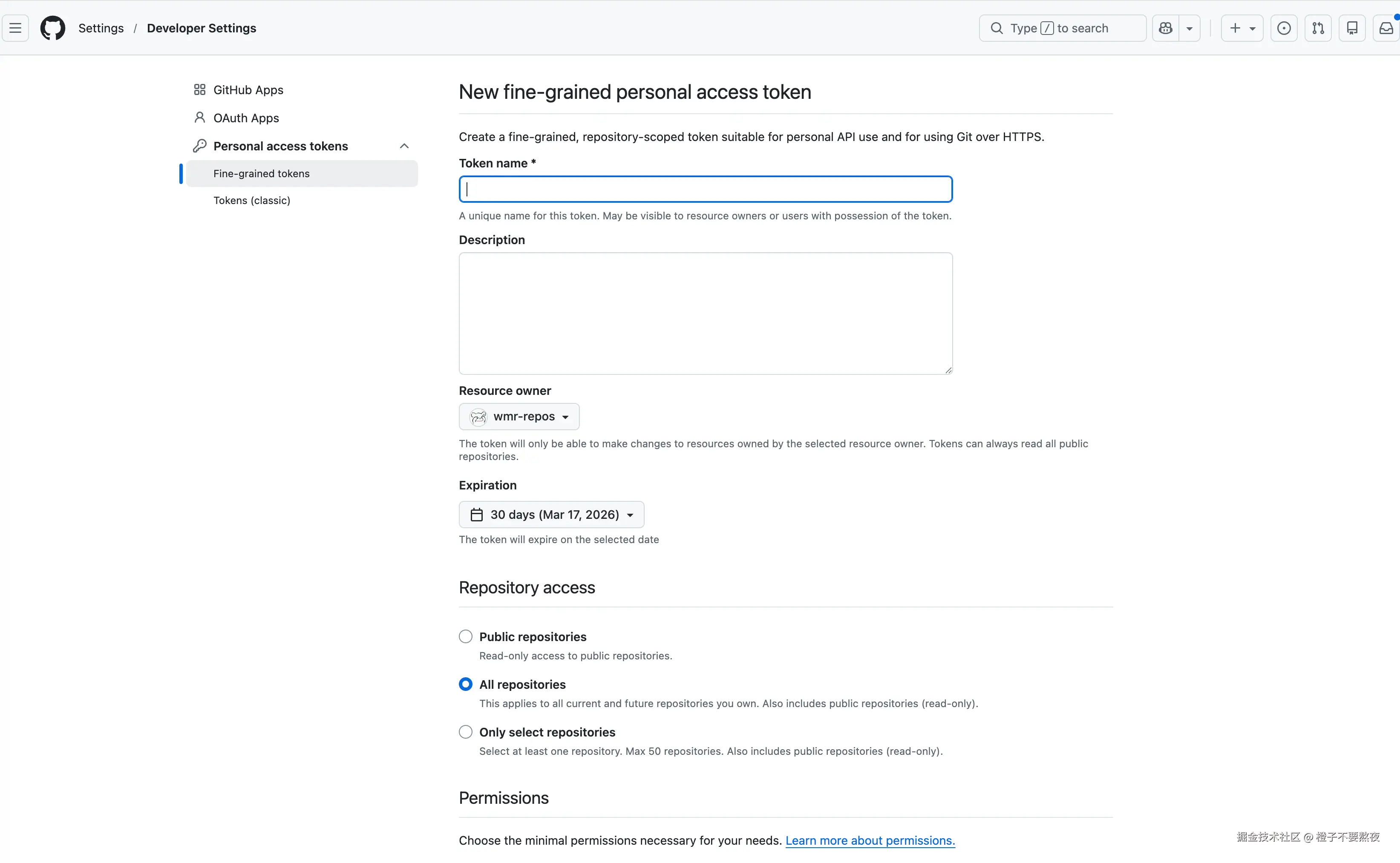 建议选择 Fine-grained tokens,并授予必要的仓库读写权限。