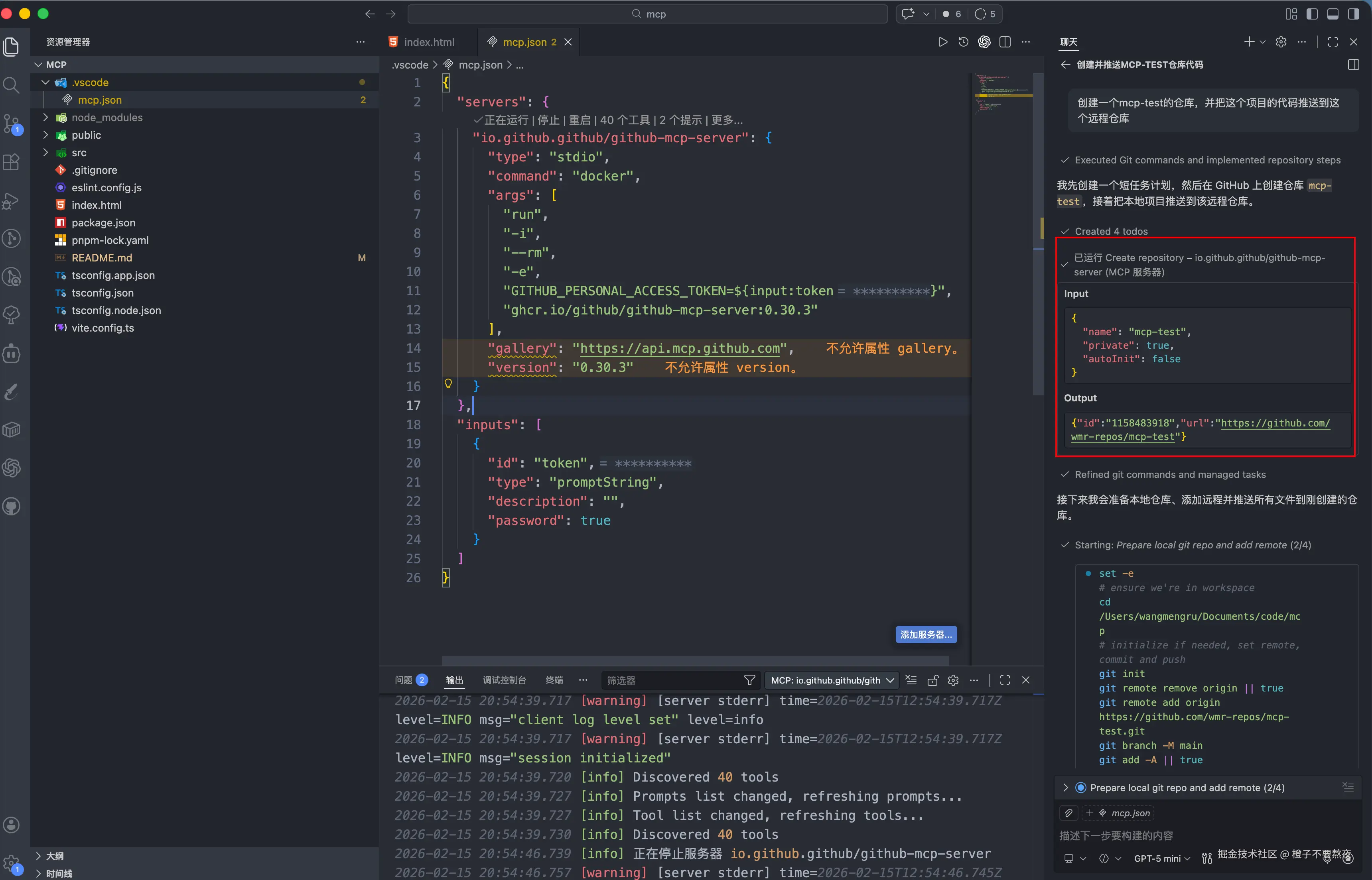 当你发出指令后,AI 会通过 MCP 调用 GitHub API 执行操作,并在聊天窗口中返回执行结果。