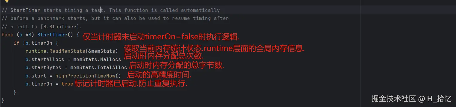 StartTimer()负责启动计时并初始化内存相关计数.测试执行时会自动调用.一般不需