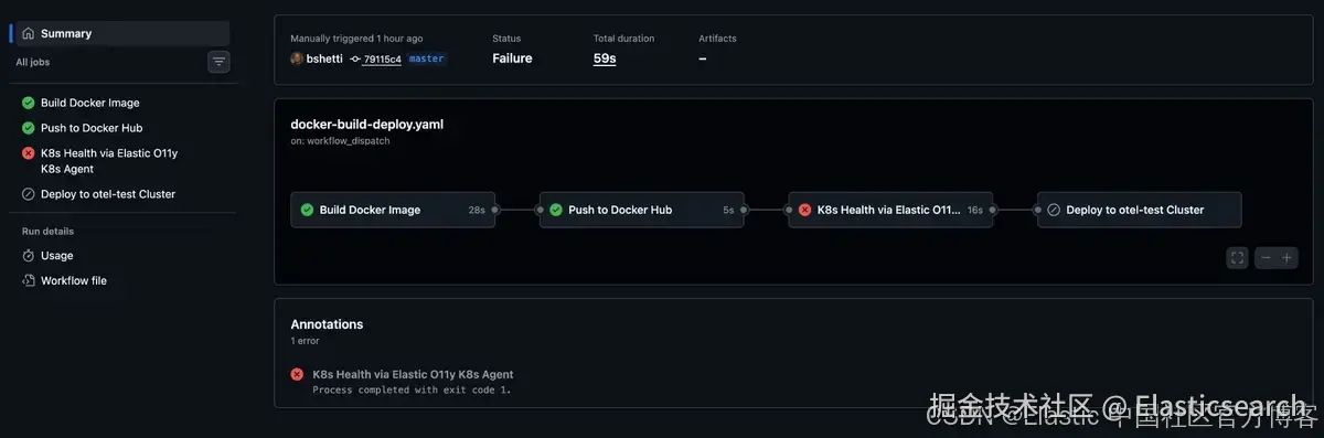 - 通过 Elastic O11y K8s Agent 检查 K8s 健康 (16s) — 失败