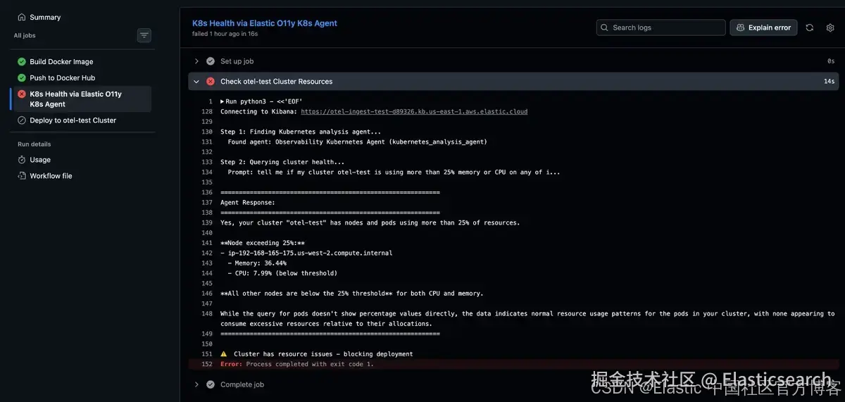 当集群超过容量阈值时,工作流会自动阻止部署。在这个示例中,我没有真正给集群施加负载,而是使用了一个简单的检查:如果资源使用率超过 25%,就故意停止部署。