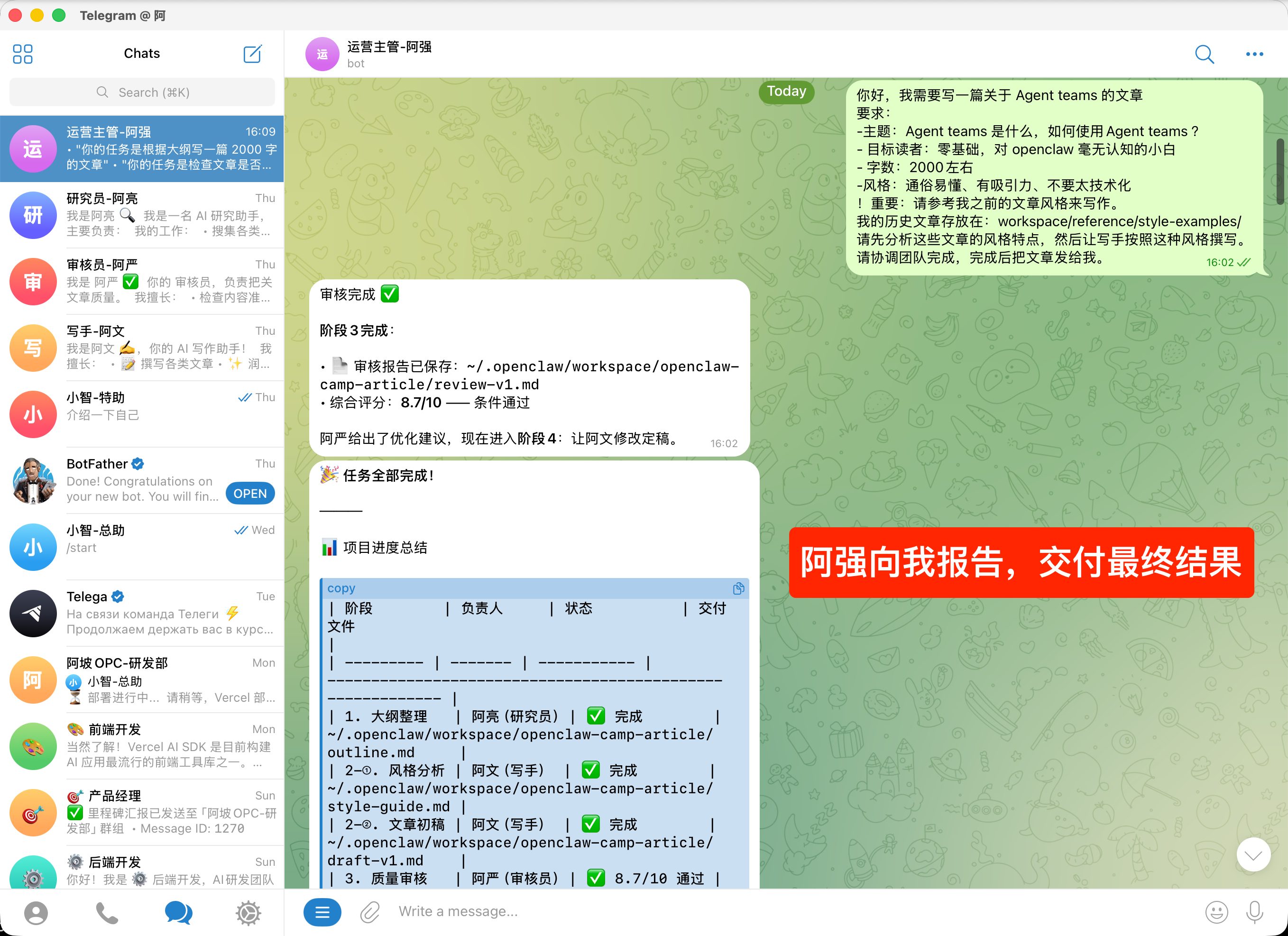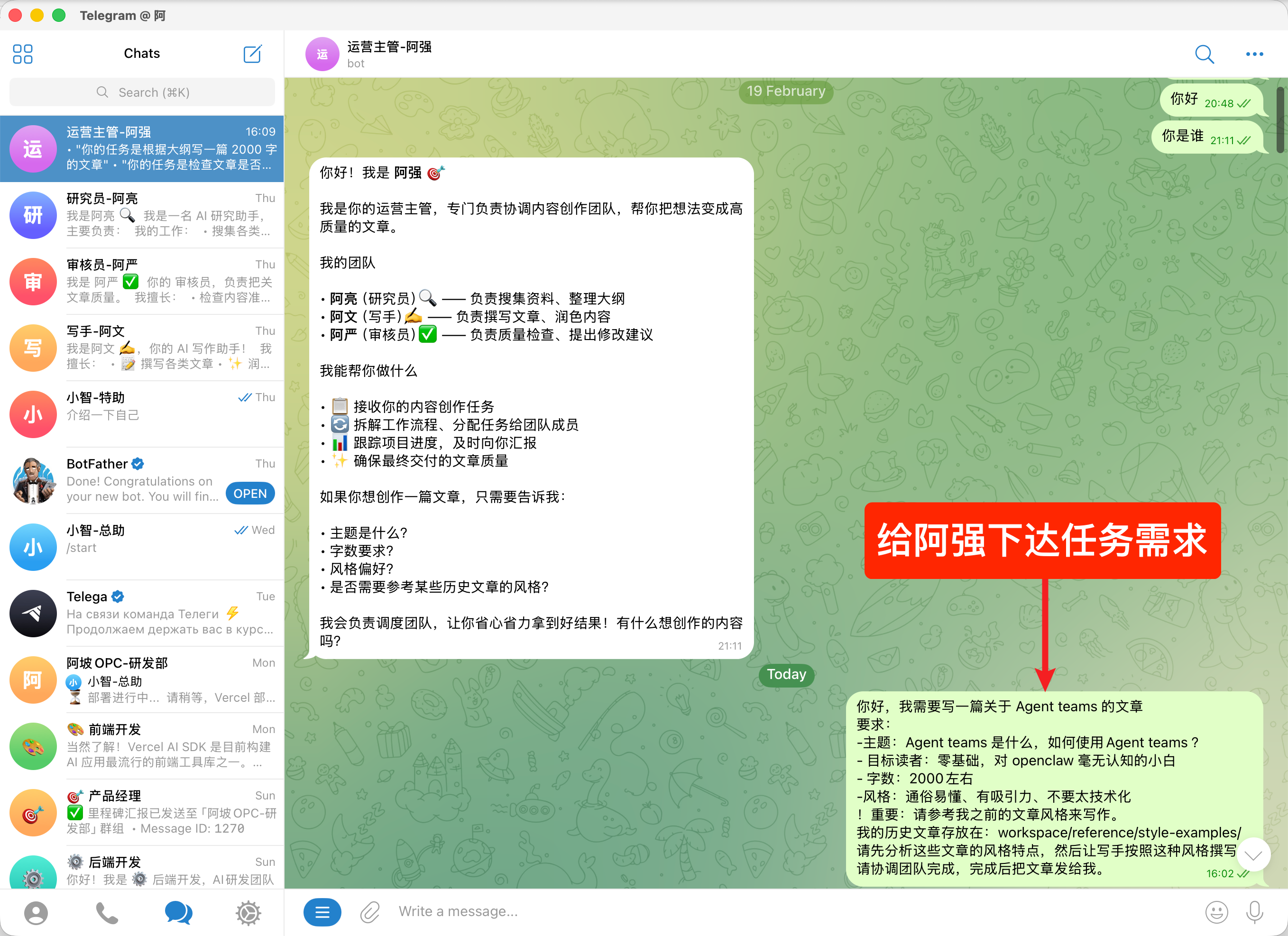 简单来说,就是只跟阿强说话,让他自动协调其他三个Bot完成文章写作: