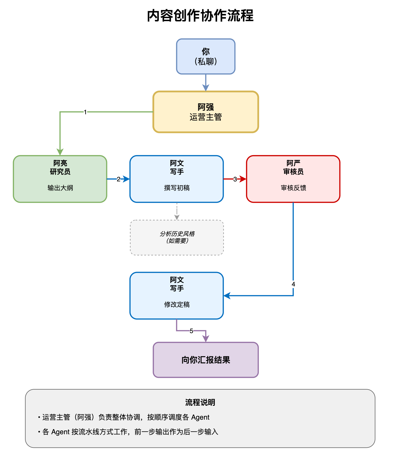 最近,我在折腾OpenClaw的多Agent团队协作功能,想搭建一个AI写作团队:运营主管阿强、研究员阿亮、写手阿文、审核员阿严,4个Bot协作写文章。