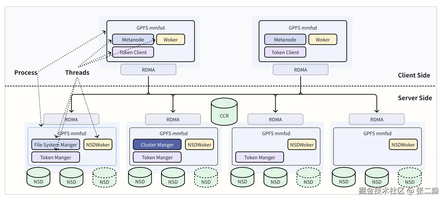 由于GPFS中的客户端是有状态的,所以一个GPFS集群可以分Server Side和Client Side分开来看,可以认为客户端和服务端共同组成了GPFS集群。