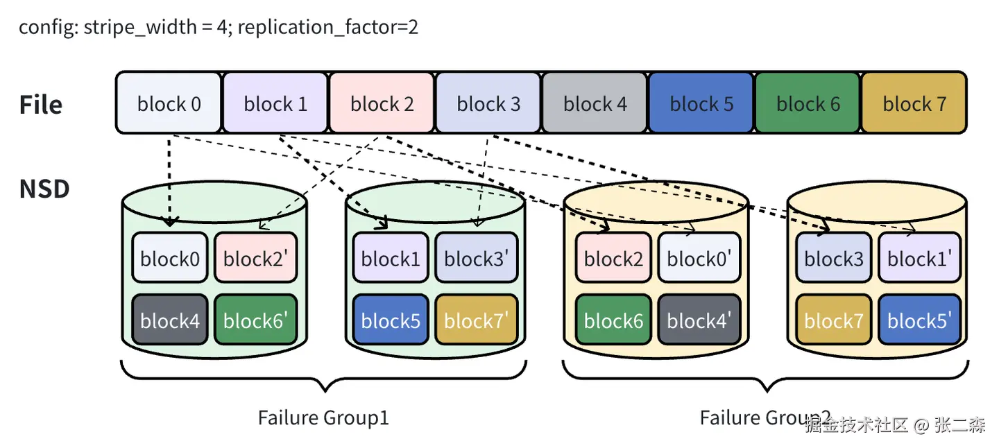 条带化(striping)指的是将一个文件按照固定大小(如1MB)切分成数据块,将数据块按照一定规则(比如 round-robin、failure group)分散存储到多个磁盘(NSD)上。